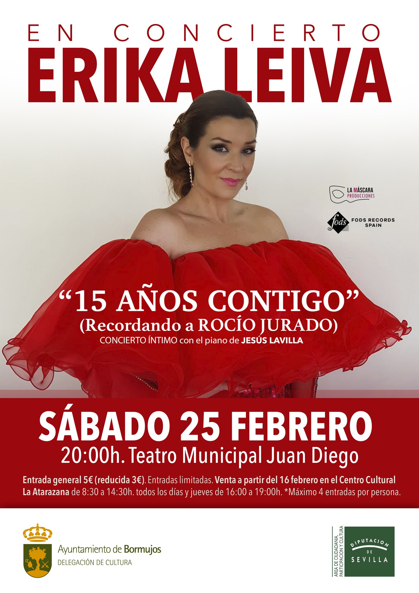 El sábado 25 de febrero llega a Bormujos el concierto de Erika Leiva "15 años contigo" recordando a Rocío Jurado, un concierto íntimo con el piano de Alejandro Cruz.