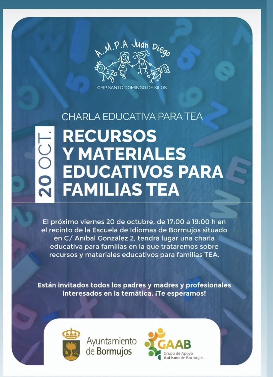 El Ampa Juan Diego de Bormujo , en colaboración con el Ayuntamiento de Bormujos, organiza una nueva charla educativa para TEA sobre 'Recursos y materiales educativos para familias TEA'.