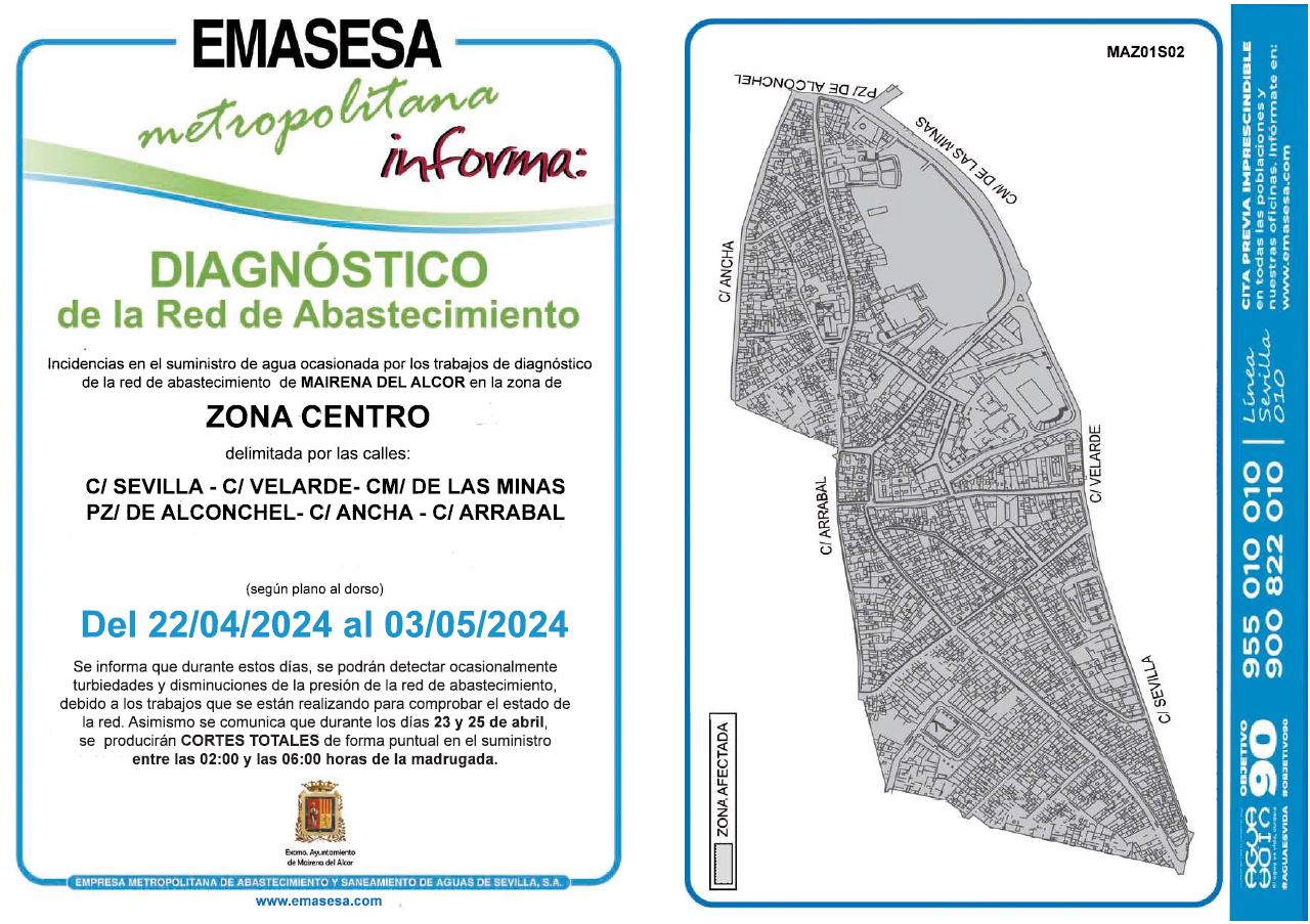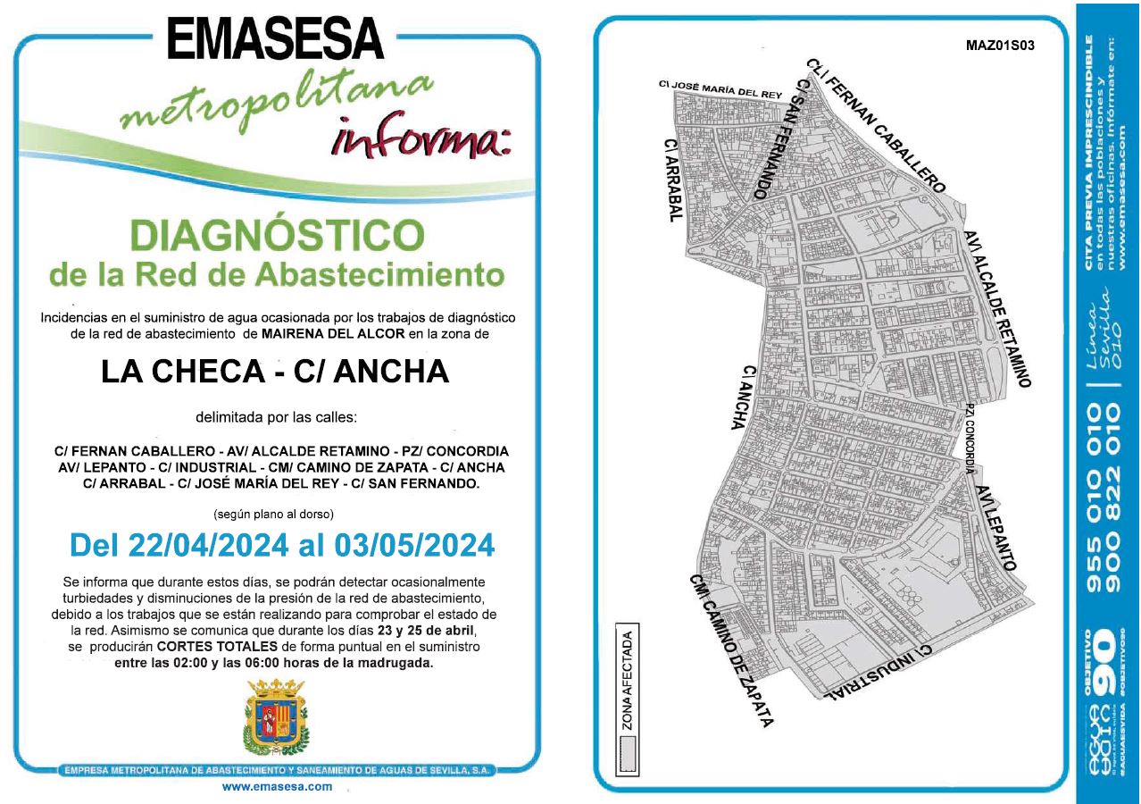 Emasesa Metropolitana informa que por trabajos en la red de abastecimiento de la zona centro y La Checa, del 22 de abril al 3 de mayo, podrían detectarse ocasionalmente turbiedades y disminuciones de presión. Asimismo durante los días 23 y 25 de abril se producirán cortes puntuales en el suministro de agua entre las 2 y 6 horas de la madrugada.