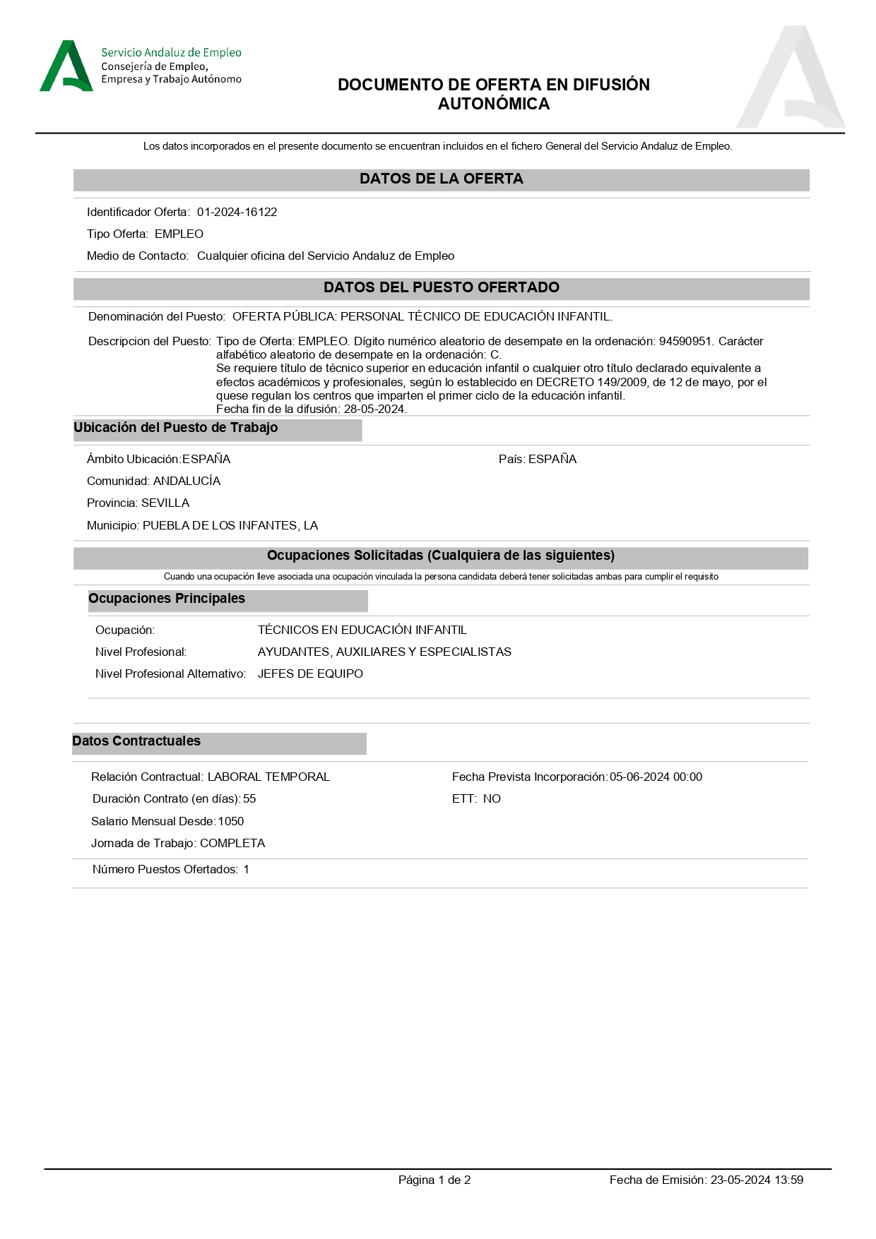 Imagen Imágenes Ubicación Categoría noticia Empleo Mostrar en el carrusel de la sección No Fecha Jue, 23/05/2024 - 15:28 Más información http://www.lapuebladelosinfantes.es/es/actualidad/noticias/Oferta-de-empleo-Tec…
