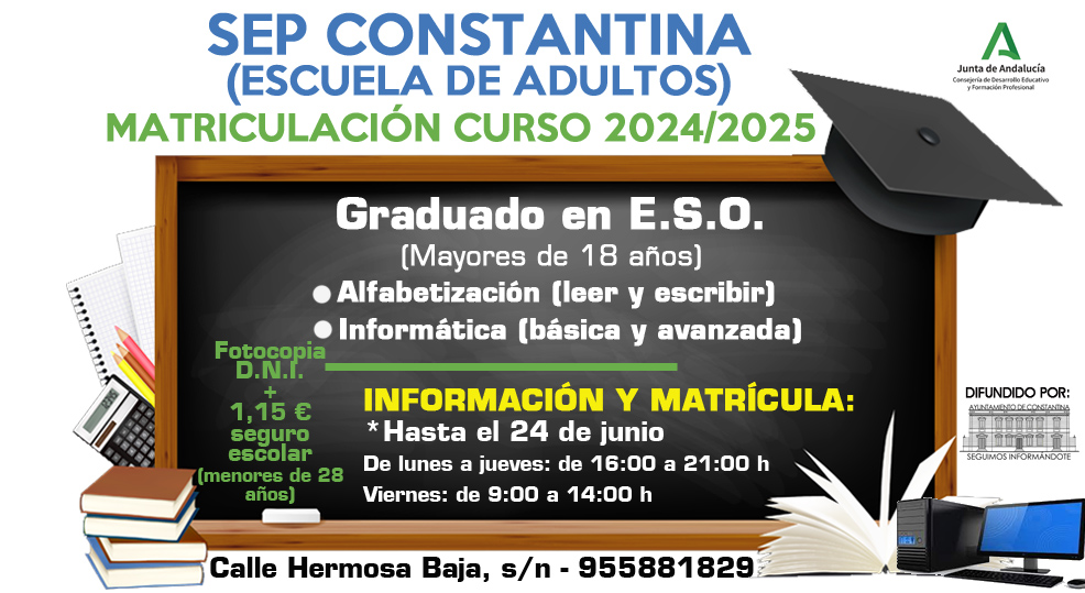 El SEP CONSTANTINA (Centro de Educación de Adultos) tiene abierto el plazo de matrícula para su curso 2024/2025.