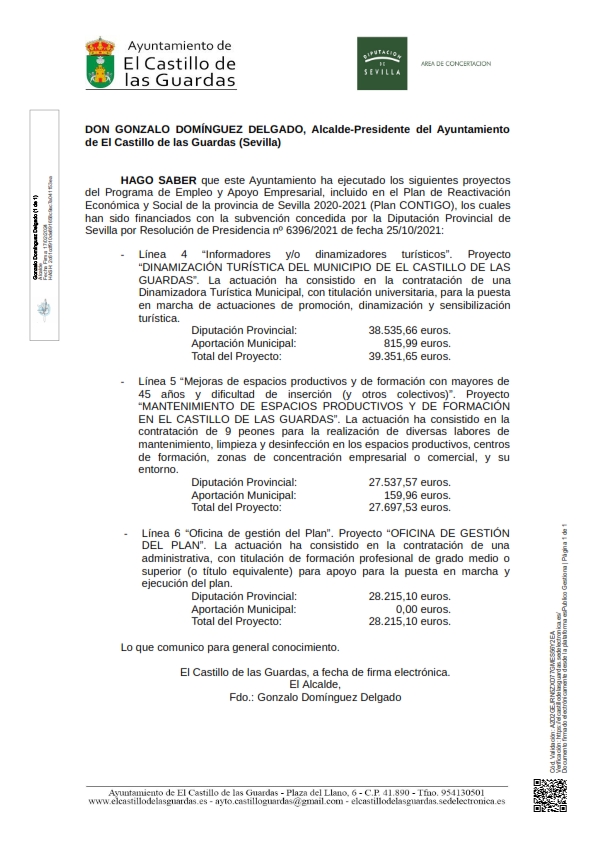 Resumen ejecución de proyectos a través del Programa de empleo y y apoyo empresarial, incluido en el Plan de reactivación económica y social de la provincia de Sevilla 2020-2021 Plan Contigo.
