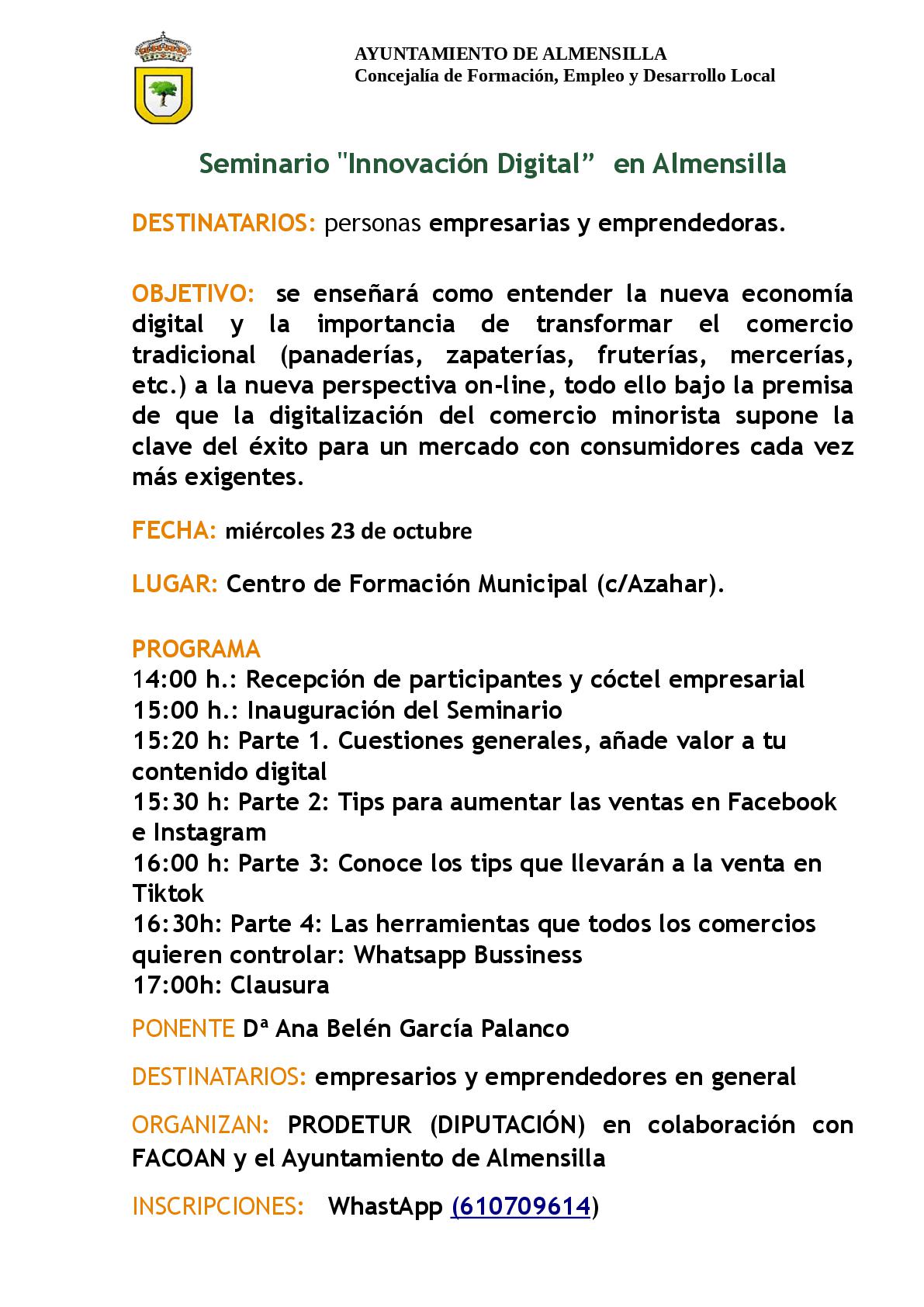El próximo miércoles 23/10/24 impartiremos en el Centro de Formación Municipal un seminario sobre INNOVACIÓN DIGITAL, de interés para PERSONAS EMPRENDEDORAS Y EMPRESAS almensilleras. Previamente se tomará un aperitivo. Las personas interesadas deben confirmar asistencia (gratuita) en: WhatsApp (619019261) o correo (adlalmensilla@dipusevilla.es o administración@facoan.es)