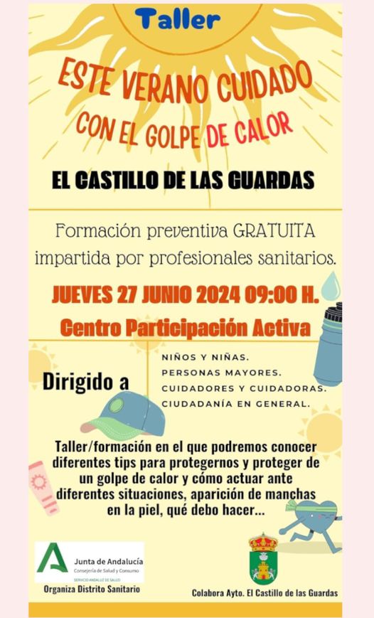 Desde el Ayuntamiento y en colaboración con nuestro distrito sanitario os invitamos a participar de este taller orientado a todas las edades y colectivos donde nos darán nociones sobre cómo actuar ante un golpe de calor, cómo prevenirlo y sobre todo cómo actuar si vemos reacciones raras en nuestro cuerpo y piel.