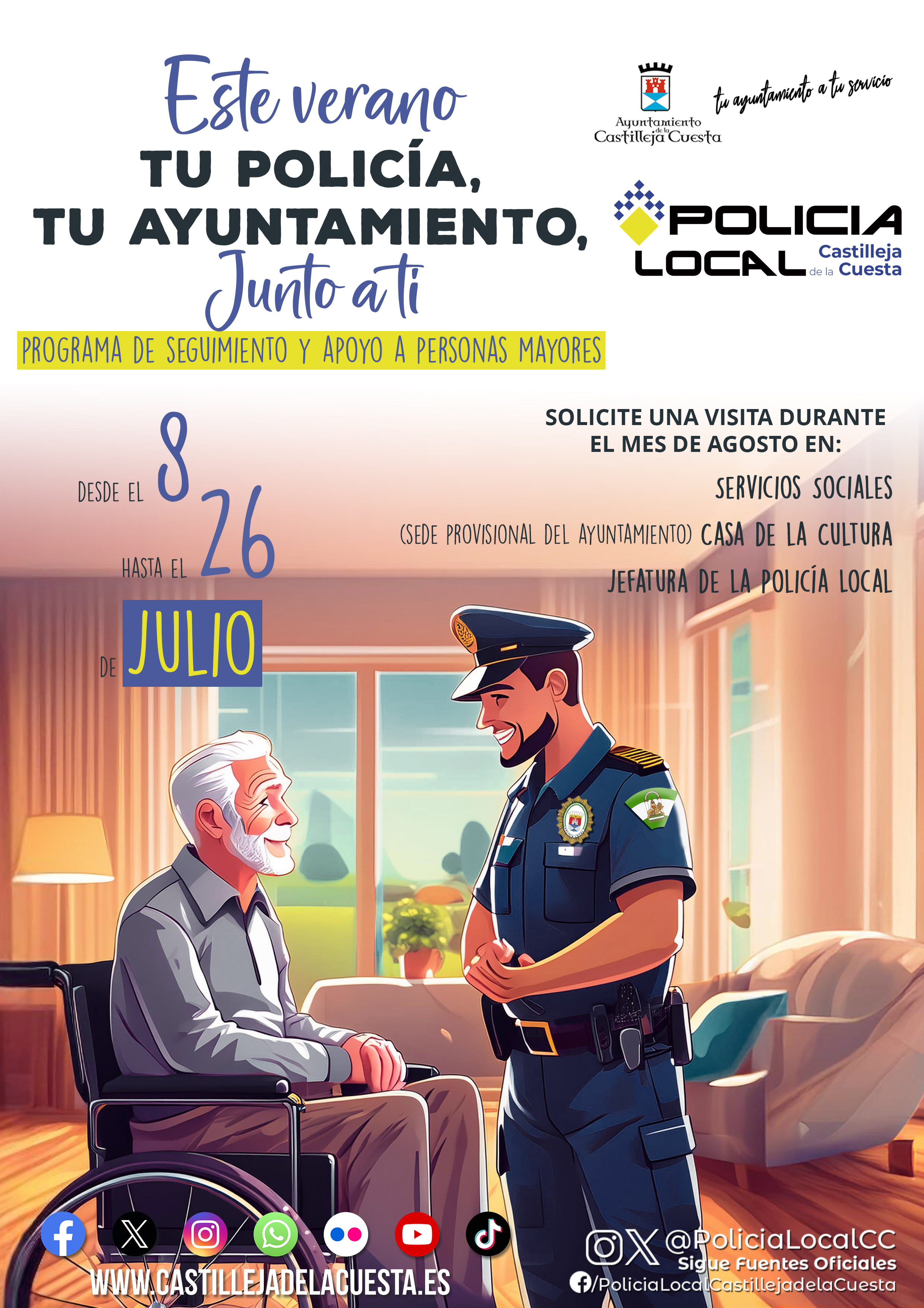 Por octavo verano consecutivo, el Ayuntamiento impulsa el programa de seguimiento y apoyo a personas mayores, especialmente a aquellas que viven solas. Este programa pionero, que desarrolla la Policía Local, velará por el cuidado de este colectivo, durante el mes de agosto.