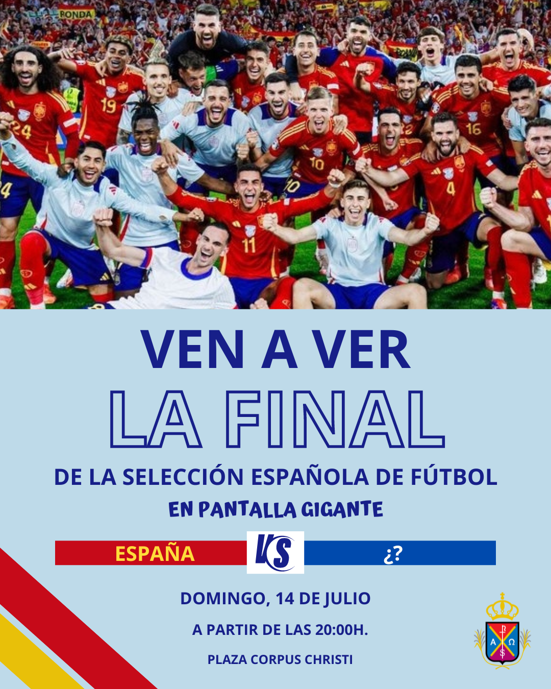 Fecha inicio Dom, 14/07/2024 - 20:00 Fecha fin Dom, 14/07/2024 - 23:30 Imágenes Ubicación Categoría evento Deportes Mostrar en el carrusel de la sección No Más información http://www.lapuebladelrio.es/es/actualidad/eventos/Final-de-la-Eurocopa-en-pant…
