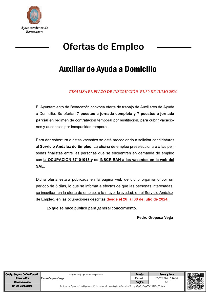 El Ayuntamiento de Benacazón convoca la oferta de trabajo en régimen de contratación temporal de Auxiliares de Ayuda a Domicilio, 7 puestos a Jornada Completa y 7 puestos a Tiempo Parcial, para sustitución, cubrir vacaiones y ausencias por incapacidad temporal.