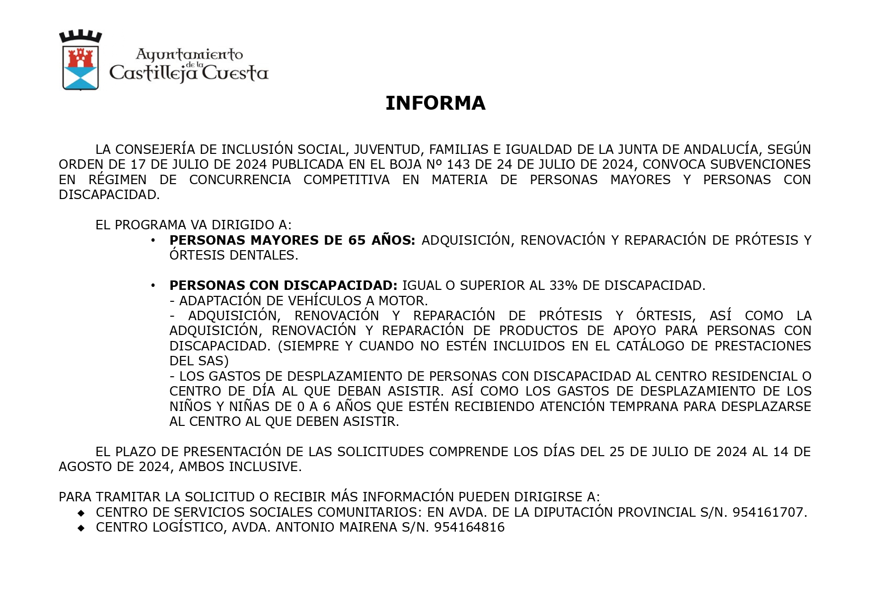 El Ayuntamiento de Castilleja de la Cuesta informa de la apertura del plazo, hasta el 14 de agosto, para solicitar ayudas individuales para personas mayores y subvenciones individuales para personas con discapacidad.