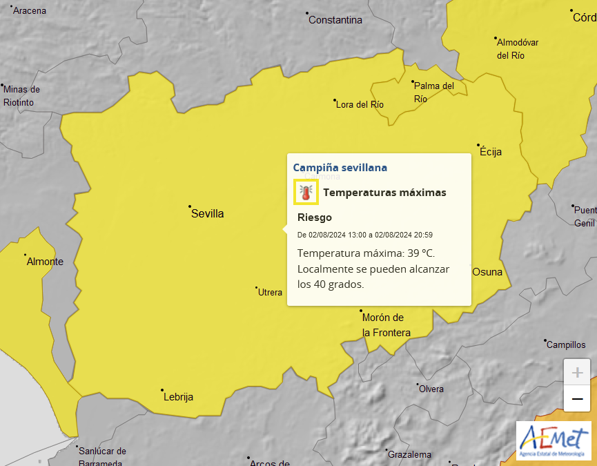 La Agencia Estatal de Meteorología activa hoy viernes 2 de agosto el aviso amarillo por temperaturas máximas que alcanzarán los 39 grados centígrados. El aviso permanecerá vigente de 13 a 21 horas.
