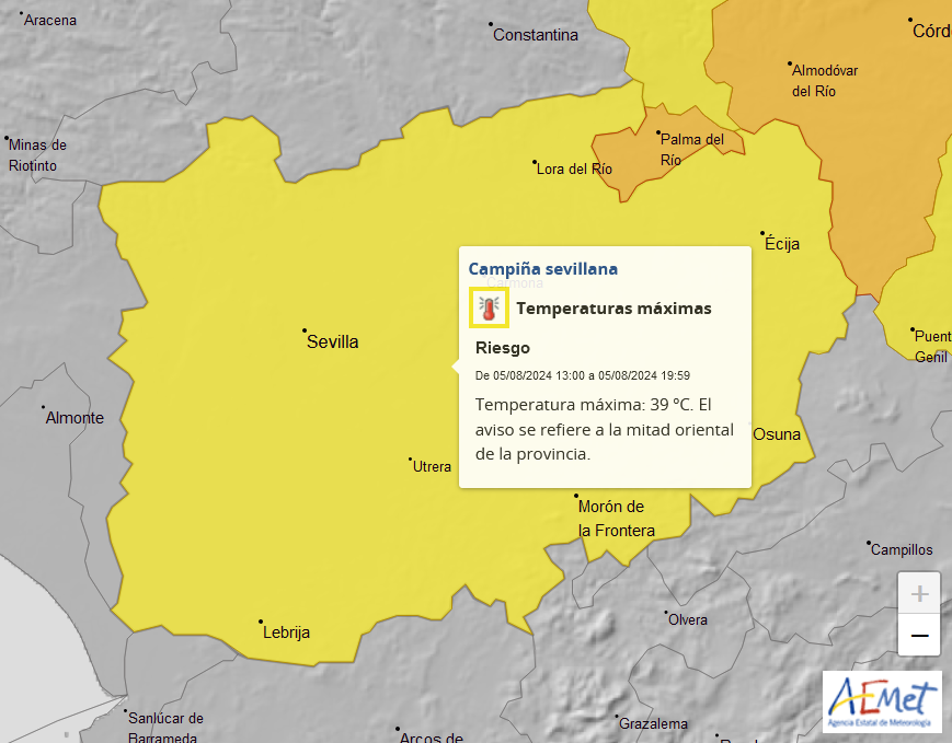 La Agencia Estatal de Meteorología activa hoy lunes 5 de agosto el aviso amarillo por temperaturas máximas que alcanzarán los 39 grados centígrados. El aviso permanecerá vigente de 13 a 21 horas.