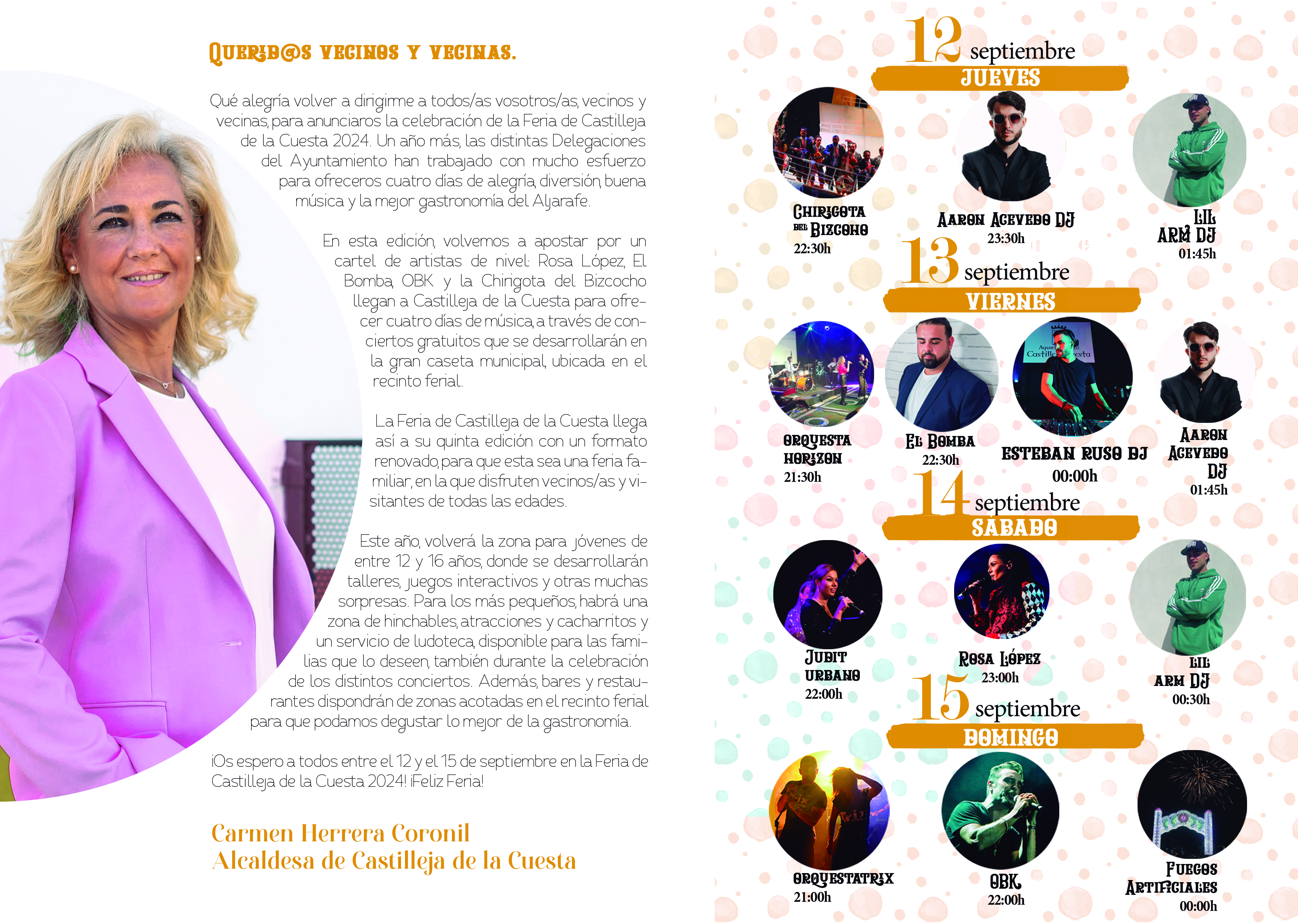 La Feria de Castilleja de la Cuesta llega a su quinta edición "con un formato renovado, pensado para un público de todas las edades y con artistas de primer nivel", ha subrayado Herrera. Un año más, una gran carpa, ubicada en el recinto ferial de la Avenida Plácido Fernández Viagas, acogerá los conciertos de los artistas ya citados y de los DJ Lil Arm, Esteban Ruso y Aaron Acevedo y las Orquestas Horizon y Orquestatrix.