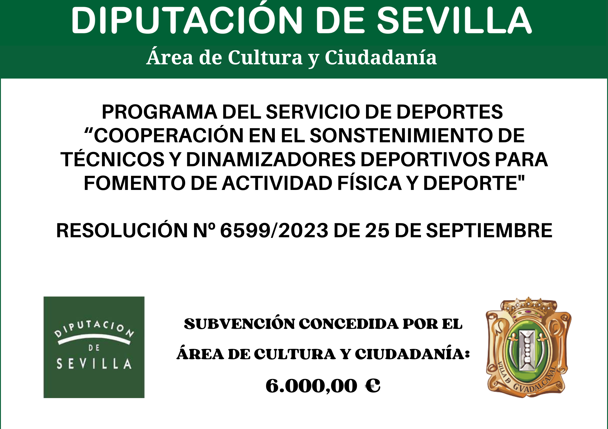 Desde el Área de Cultura y Ciudadanía de la Excelentísima Diputación de Sevilla y, por resolución número 6599/2023 de 25 de septiembre, se le concede al Ayuntamiento de Guadalcanal una subvención del programa del Servicio de Deportes destinadas a la Cooperación en el sostenimiento de técnicos y dinamizadores deportivos para el fomento de la actividad física y el deporte, ejercicio 2023.