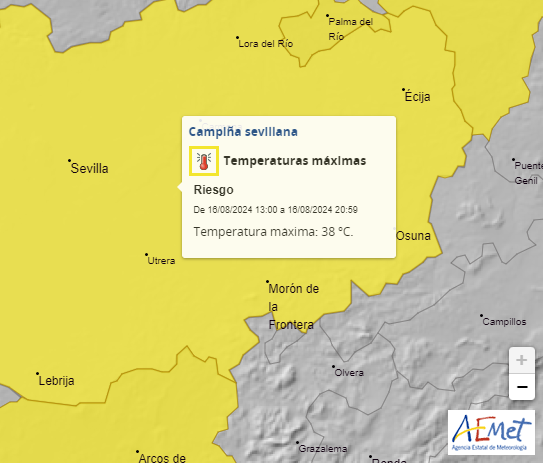 La Agencia Estatal de Meteorología activa hoy lunes 19 de agosto el aviso amarillo por temperaturas máximas que alcanzarán los 39 grados centígrados. El aviso permanecerá vigente de 13 a 21 horas.