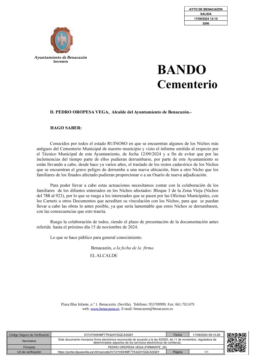 El Ayuntamiento de Benacazón informa que, debido al estado RUINOSO de algunos de los Nichos más antiguos del Cementerio de este municipio, visto el informe emitido al respecto por el Técnico Municipal con fecha 12/09/2024, a fin de evitar que por las inclemencias del tiempo parte de ellos pudieran derrumbarse, por parte de este Ayuntamiento se están llevando a cabo, desde hace ya varios años, el traslado de los restos de los Nichos que se encuentran en grave peligro de derrumbe a una nueva ubicación, bien a otro Nicho que los familiares de los finados afectados pudieran proporcionar o a un Osario de nueva adjudicación.