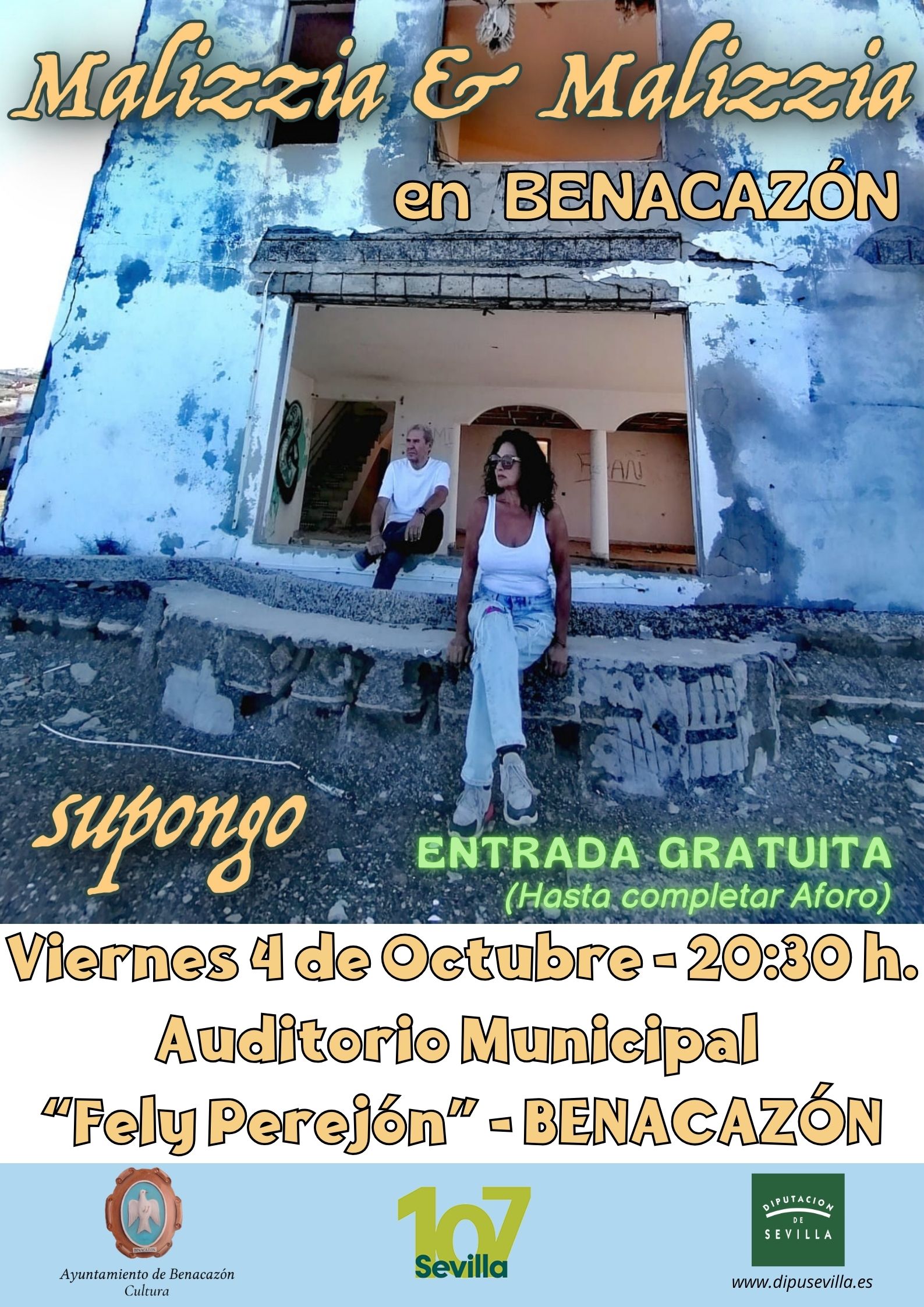 El Ayuntamiento de Benacazón informa del próximo Concierto del grupo "MALIZZIA & MALIZZIA", que actuará en el Auditorio Municipal Fely Perejón el Viernes 4 de Octubre a las 20:30 h. con ENTRADA GRATUITA. Organizado por la Delegación municipal de Cultura, a través del "107 Programa Cultural" de la Diputación de Sevilla. La Delegada del área, María Rosario Fernández Santos, os invita a disfrutar de este especial concierto, con el que inauguraremos la Programación Cultural de Otoño en Benacazón. *"Malizzia & Malizzia" cuenta con una gran carrera musical desde que en el año 1996 ganó el festival de Benidorm con la canción "Y no puedo más", desde entonces no han dejado de hacer conciertos por todo el territorio nacional. Autores de todos sus temas y componiendo también para otros conocidos artistas.