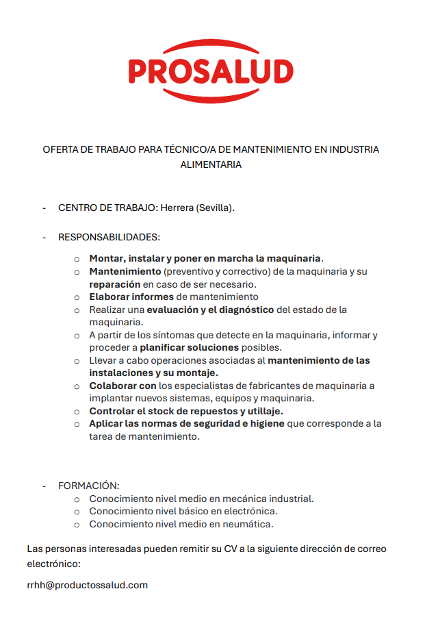 Se necesita Técnico/a de mantenimiento en industria alimentaria.