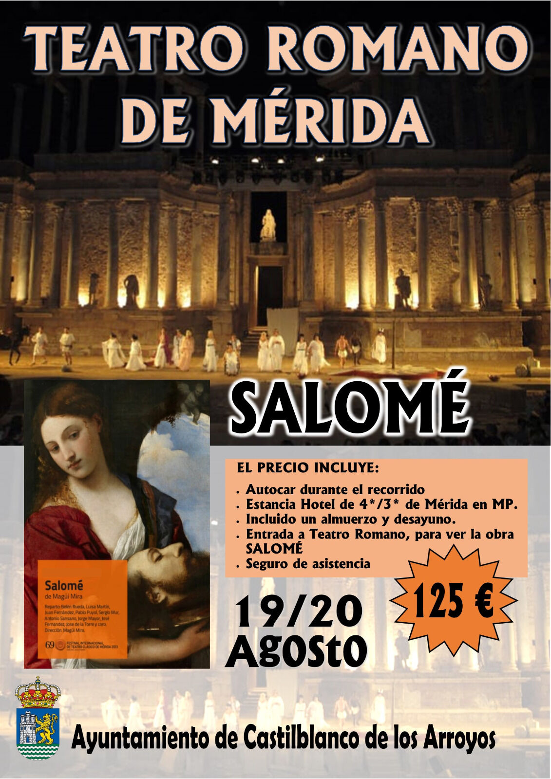 El precio por persona es de 125€, incluyendo noche de hotel en régimen media pensión (desayuno y almuerzo), entrada al Teatro, viaje en autobús con salida y regreso a Castilblanco y seguro de viaje.