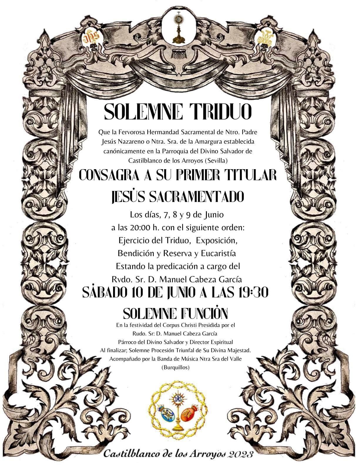 Nuestro pueblo se engalana con motivo de la festividad del Corpus Christi. Será este sábado 10 de junio, con la celebración de la Solemne Función que dará comienzo a las 19:30 horas y que continuará con la Procesión Triunfal a las 20:00 horas con salida por la puerta lateral de la Iglesia Parroquial, en la calle Juan Ramón Jiménez.