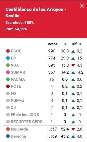 Castilblanco ha registrado en estas Elecciones Generales una participación del 64,12%, volviendo a ser el PSOE la fuerza más votada a nivel local con un 38,30% de los votos, seguido del PP con un 29,91%, VOX con un 15,3% y SUMAR con un 14,2%.