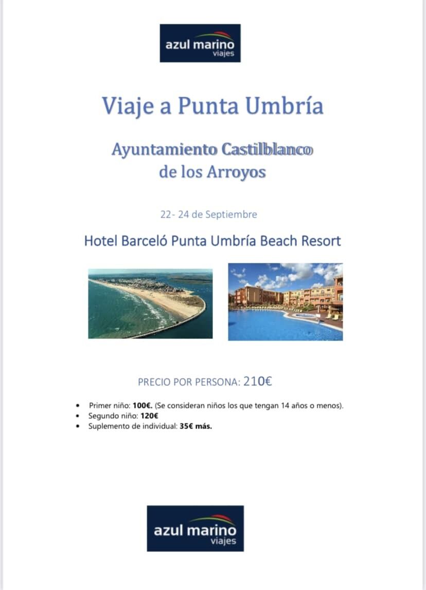 Organizado para el fin de semana del 22 al 24 de septiembre, el destino elegido es Punta Umbría, con estancia en el hotel Barceló Punta Umbría Beach Resort en régimen pensión completa, incluyendo los almuerzos del viernes y el domingo.