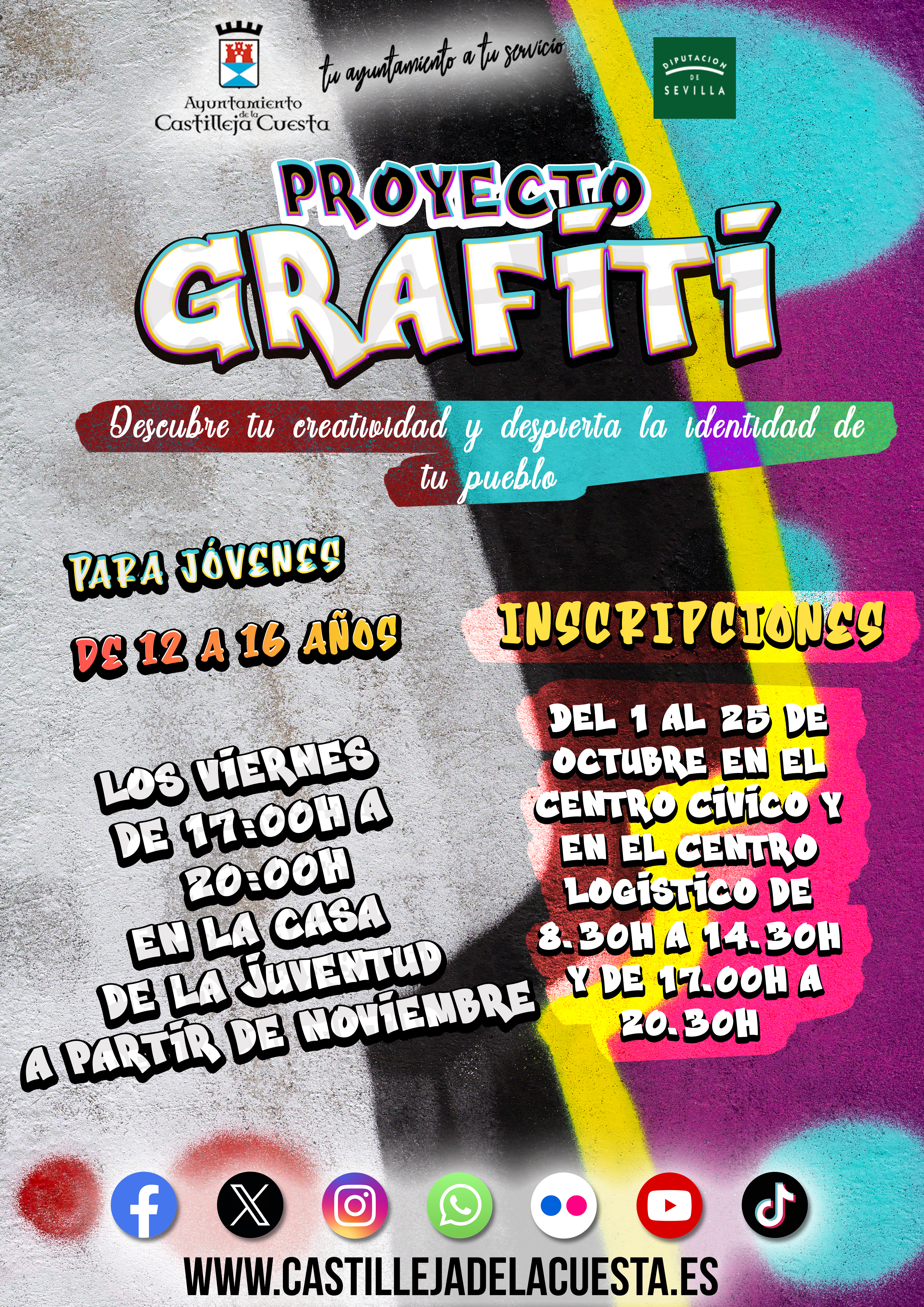 - taller de grafitis para explorar temas como el medio ambiente, el respeto, posibles soluciones a la deforestación y la igualdad de genero. Asimismo, se les pedirá que trabajen en torno al patrimonio de Castilleja de la Cuesta y en torno espacios que consideren significativos para ellos/as.