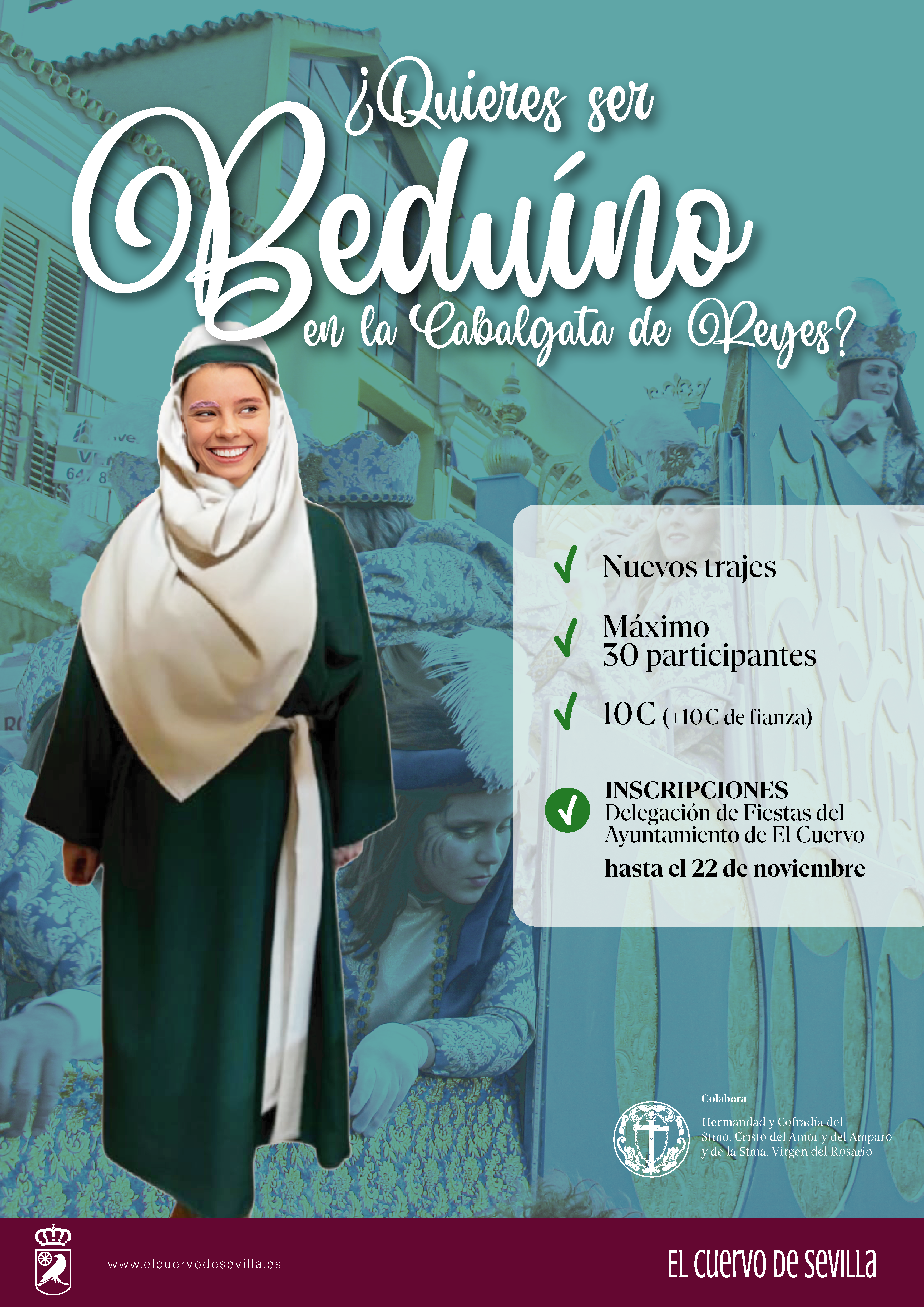 Desde la delegación de Fiestas del Ayuntamiento de El Cuervo, ya se ha abierto el plazo para aquellas personas que quieran participar como beduinos en la próxima cabalgata de SSMM Los Reyes Magos.
