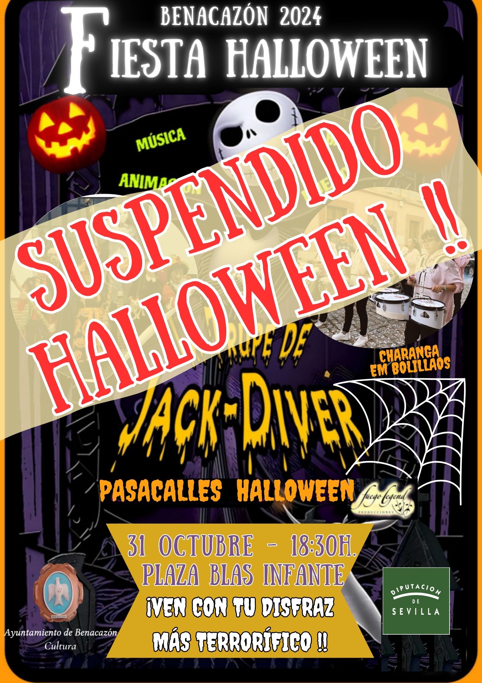 Disfrutaremos del PASACALLES familiar "LA TRUPE DE JACK DIVER" (Fuego Legend Producciones), de animación y temática HALLOWEEN con música, malabares y fuego, que irá por el recorrido tradicional del municipio amenizado por la CHARANGA EM BOLILLAOS.