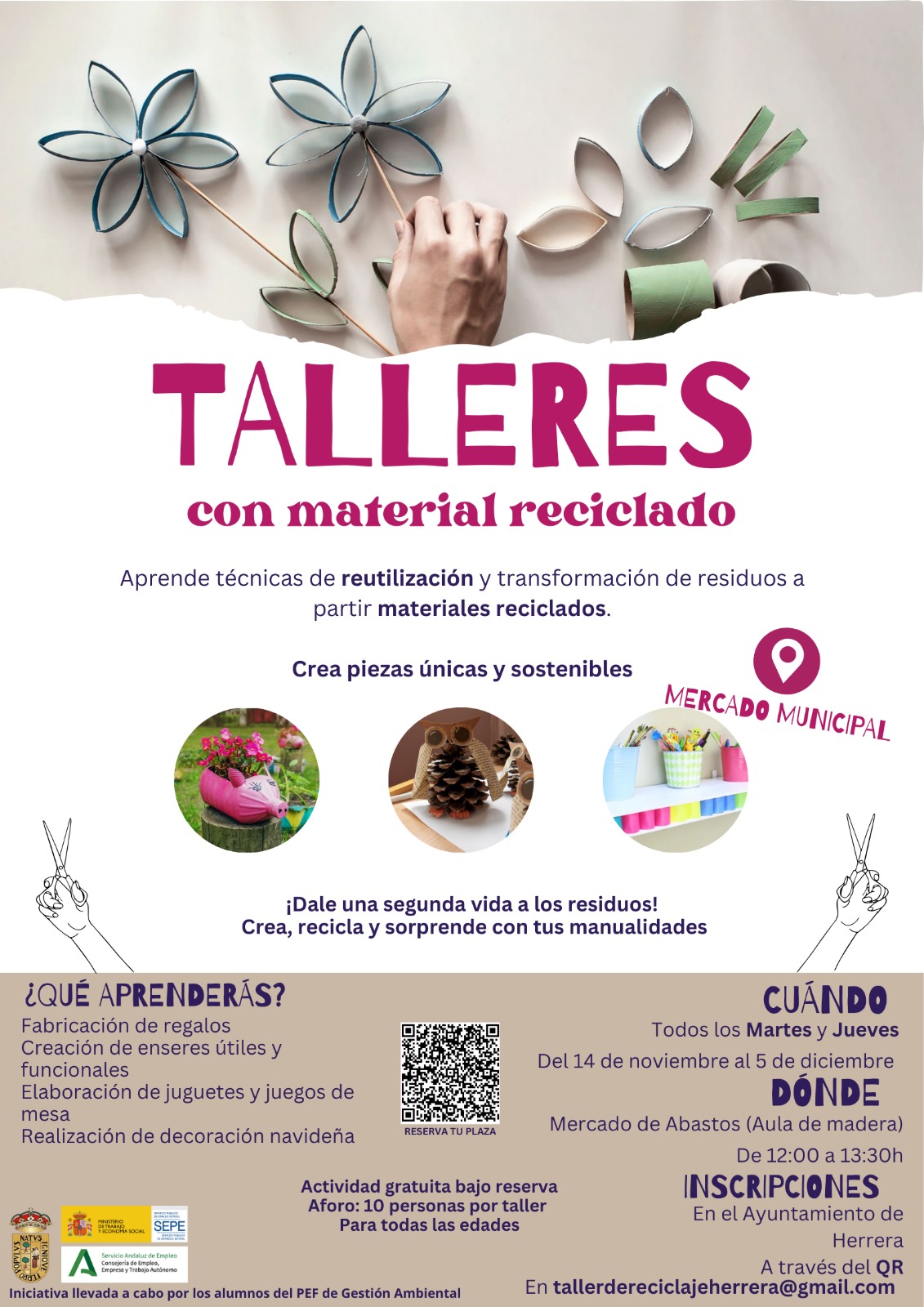 Estas clases tendrán lugar todos los martes y jueves, del 14 de noviembre al 5 de diciembre, en el Aula de madera del Mercado de Abastos en horario de 12:00 a 13:30 horas. Se trata de una actividad gratuita, con aforo limitado y bajo reserva. Puedes inscribirte en el Ayuntamiento de Herrera, en el correo tallerdereciclajeherrera@gmail.com o a través del siguiente enlace: