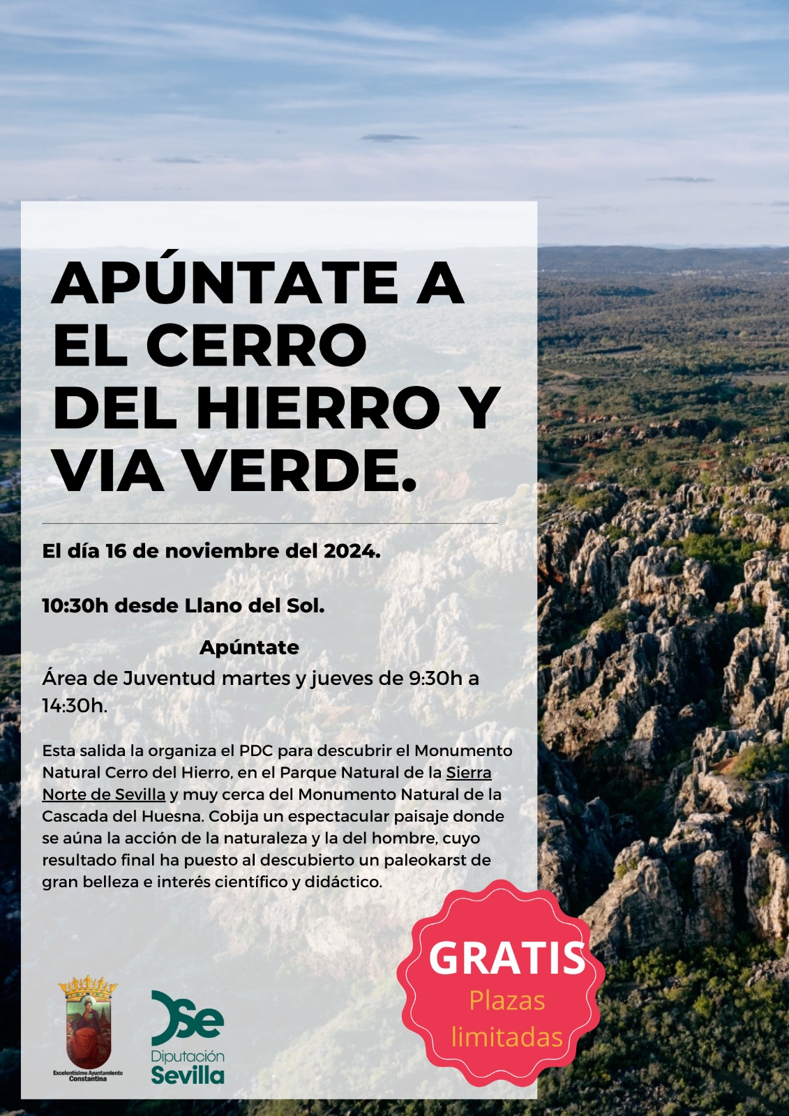 Organizado por el Programa de Desarrollo Comunitario del Ayuntamiento de Constantina, en colaboración con Diputación de Sevilla, el próximo sábado 16 de noviembre te llevamos a conocer el monumento natural de El Cerro Hierro y la Vía Verde.