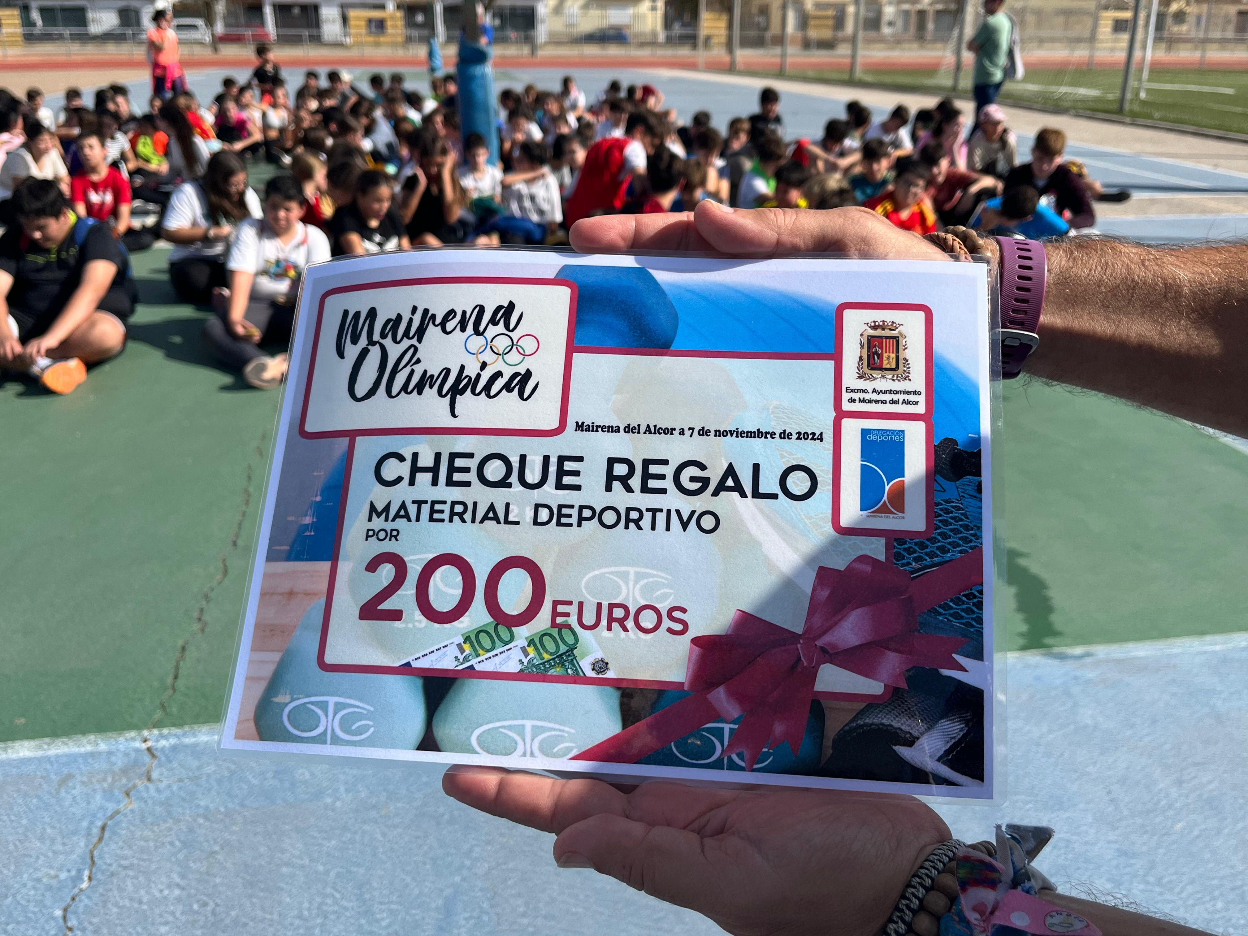 El concejal de Deportes, Javier Rodríguez, ha hecho entrega de los premios de la quinta edición de Mairena Olímpica, esta tarde en el polideportivo. Los institutos Los Alcores y María Inmaculada han recibido un cheque valorado en 200 euros para canjear a lo largo del curso escolar por material deportivo en Deportes Reja.