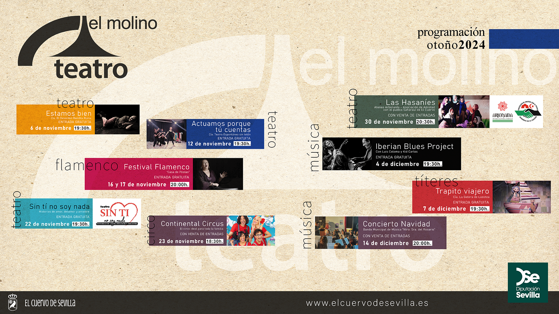 La delegada de Cultura del Ayuntamiento de El Cuervo de Sevilla, Noelia Pan López, ha dado a conocer la programación del teatro "El Molino" para el otoño-invierno de este 2024.