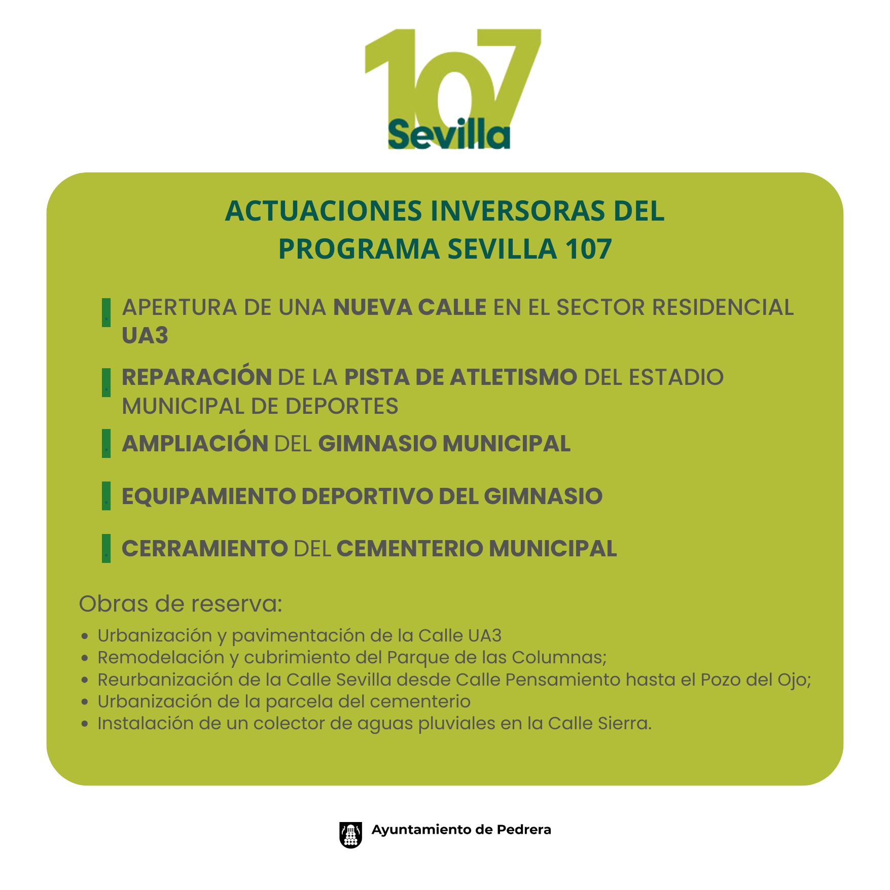 El Ayuntamiento de Pedrera ha aprobado por unanimidad la ratificación de la memoria descriptiva del programa provincial Sevilla 107. Este plan, promovido por la Diputación de Sevilla, es la nueva edición de las subvenciones para inversiones municipales, sucesor de los anteriores programas conocidos como Plan Supera, Plan Contigo o Plan Actúa. La propuesta fue respaldada por los grupos políticos de Izquierda Unida, con 10 votos a favor, y el PSOE, con 2 votos a favor.