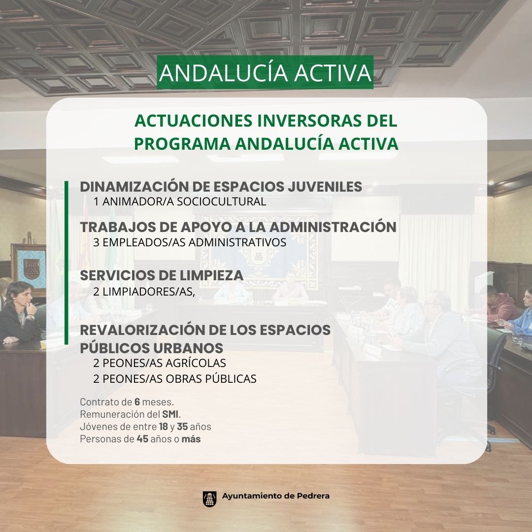 El pleno del Ayuntamiento de Pedrera aprobaba, este jueves, la ratificación de la memoria descriptiva del Programa Andalucía Activa, un plan impulsado por la Junta de Andalucía con el objetivo de fomentar el empleo entre diversos colectivos de edad. Este punto fue respaldado por los dos grupos políticos del consistorio, Izquierda Unida, con 10 votos, y el PSOE, con 2 votos.