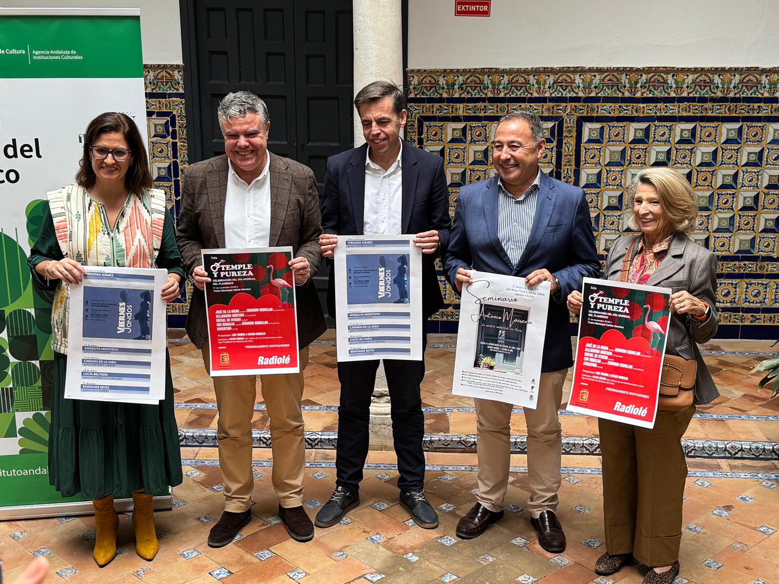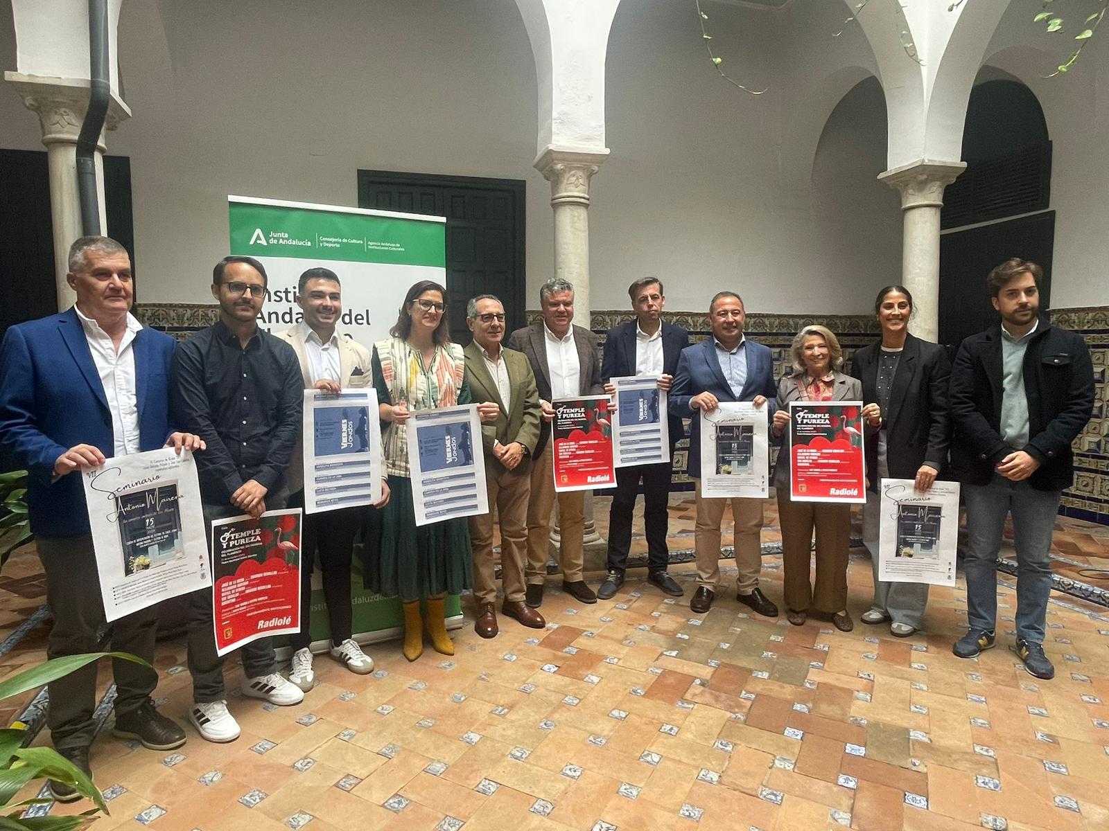 El delegado del Gobierno de la Junta en Sevilla, Ricardo Sánchez, el director del Instituto Andaluz del Flamenco, Cristóbal Ortega, y el alcalde de Mairena del Alcor, Juanma López, han presentado hoy Noviembre Flamenco en la sede del Instituto Andaluz del Flamenco. También ha asistido la diputada y concejala de Flamenco, Gloria Guillén, concejales de la corporación municipal y personalidades como Cristina Heeren.