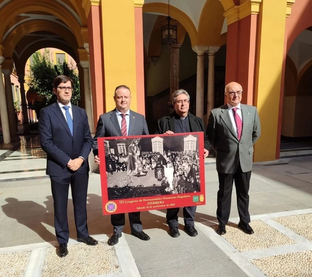 El pasado jueves, 7 de noviembre, tuvo lugar la presentación del III Congreso de Hermandades Nazarenas Singulares en la sede del Arzobispado de Sevilla, bajo la presidencia del Delegado Diocesano de HHCC de la Diócesis de Sevilla, Marcelino Manzano, y la presidencia del Presidente de la Congregación, Vicente Romero, el Hermano Mayor de la Hermandad de Jesús Nazareno de Herrera, Eduardo Montaño, y el teniente alcalde de Herrera, Alejandro Suárez. El congreso que se celebrará el próximo sábado, 16 de noviembre, en Herrera.