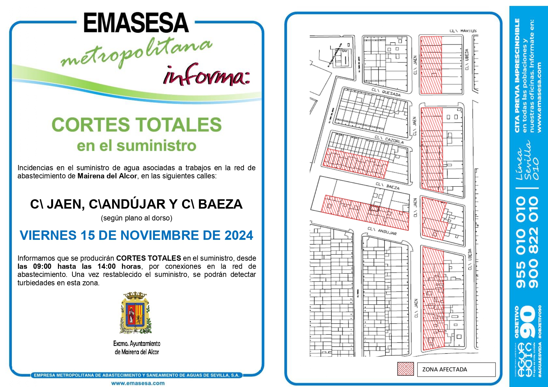 Emasesa Metropolitana informa que por trabajos de conexiones en la red de abastecimiento, el viernes 15 de noviembre se producirán cortes totales en el suministro de agua entre la 9 y 14 horas.