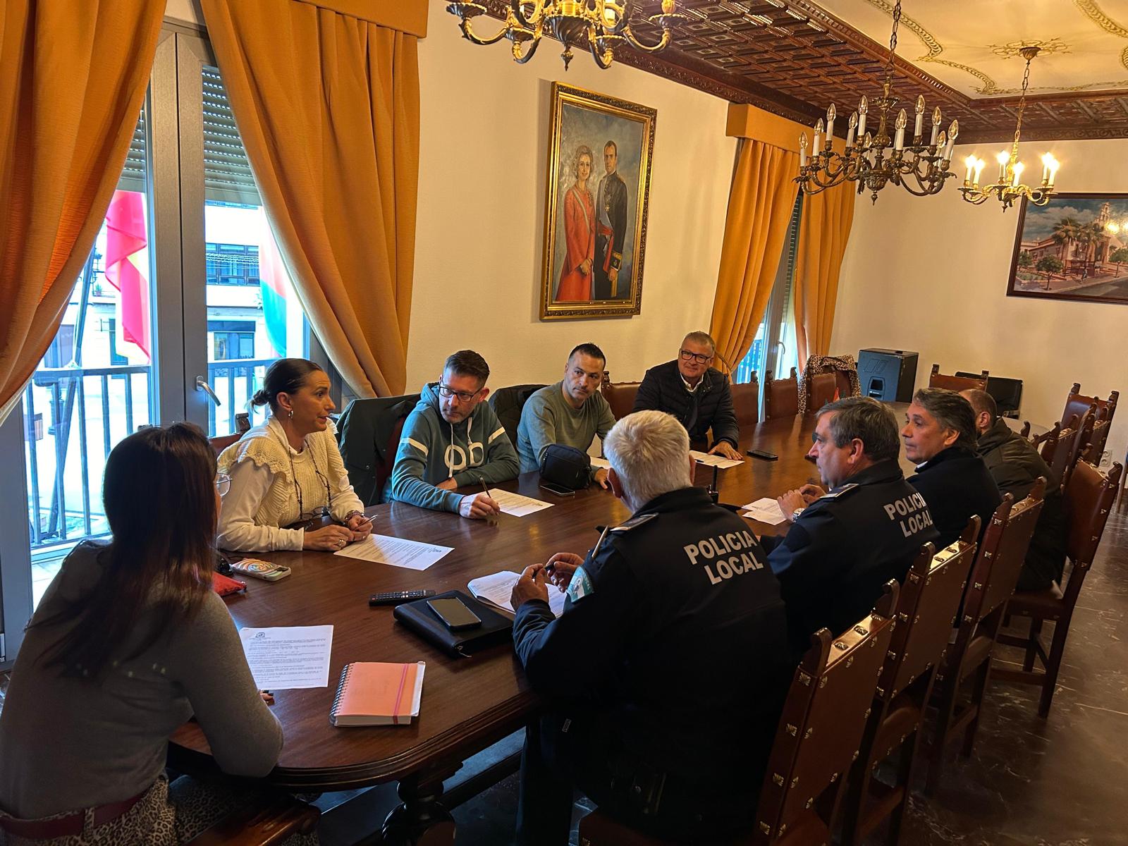Las concejalas de Festejos y Seguridad Ciudadana, Inmaculada Galocha y Miriam Domínguez, el animador coordinador de Cultura, Rubén Hernández, el subinspector jefe de la Policía Local, Juanma Galocha, y el agente de Policía Local, Joaquín Navarro, se han reunido hoy para coordinar el Plan de Seguridad Navidad 2024 junto a los gerentes de los establecimientos afectados con motivo de las celebraciones multitudinarias como son la Tardebuena, Tardevieja y otras actividades de la programación navideña.
