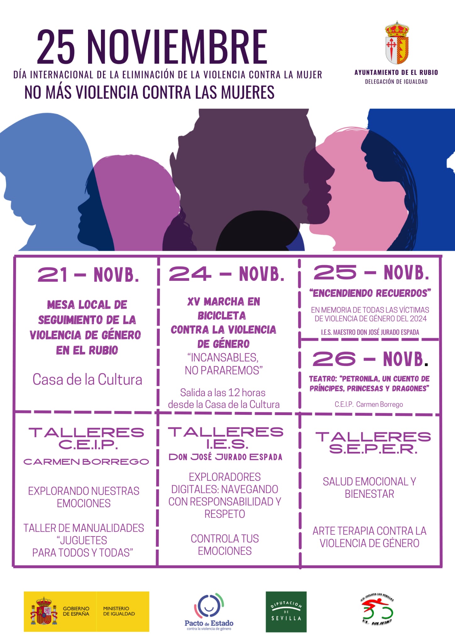 Desde el 21 de noviembre, la Delegación de Igualdad del Ayuntamiento de El Rubio organiza una serie de actividades enfocadas a sensibilizar a vecinos y vecinas en la necesidad de eliminar esta lacra social.