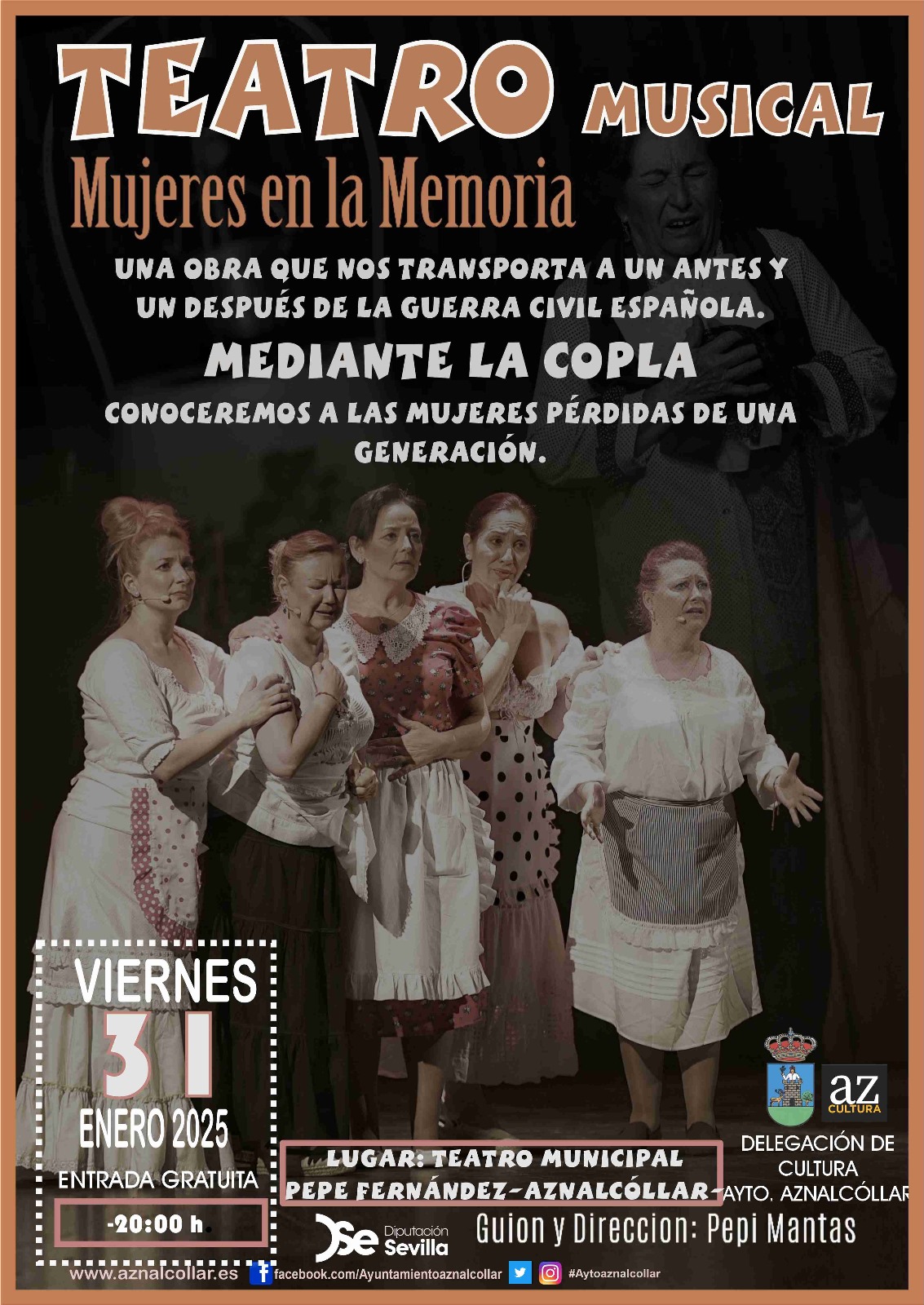 La obra de teatro musical "Mujeres en la Memoria" es una obra que nos transporta a un antes y un después de la guerra civil española. Mediante la Copla conoceremos a las mujeres pérdidas de una generación.