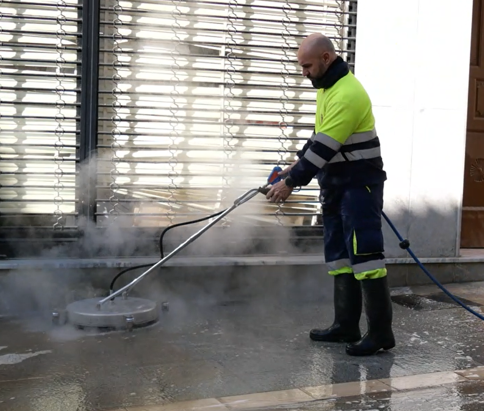 José Romero, concejal de Limpieza y Coordinación de Barrios, ha presentado esta mañana una máquina de última generación para recuperar el estado original del pavimento. Un dispositivo que trabaja a potencia de 300 bares con productos desengrasantes y detergentes de alta calidad.
