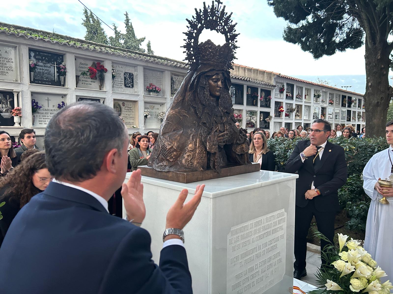 El pasado sábado la Virgen de los Dolores volvía a salir a la calle, en su segundo rosario público por los difuntos, realizando una visita histórica al Cementerio, donde se bendijo el monumento de la Dolorosa que la Hermandad solicitaba al Ayuntamiento colocar en estas instalaciones, en reconocimiento y recuerdo de los que ya no están y que un día fueron los encargados de transmitir la fe y la devoción hacia esta talla.