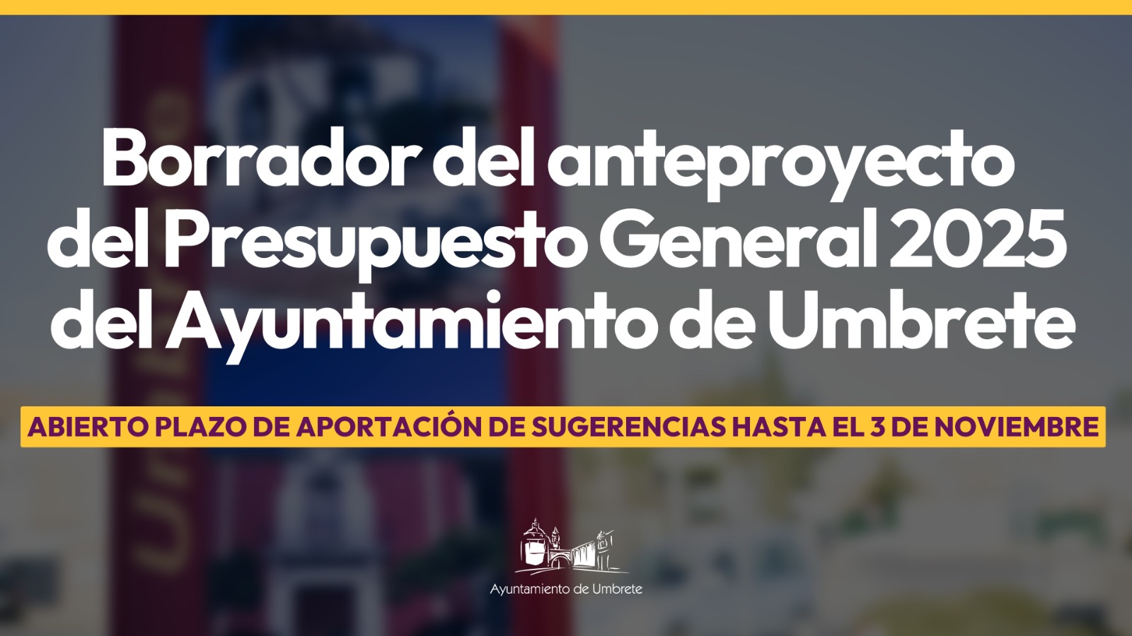 Adjunto publicamos el borrador del anteproyecto del Presupuesto General del Ayuntamiento de Umbrete para el próximo año 2025, quedando abierto un plazo desde hoy, 29 de octubre de 2024, hasta el 03 de noviembre 2024, para que los ciudadanos individualmente, colectivos o entidades hagan sus aportaciones y/o propuestas al mismo.