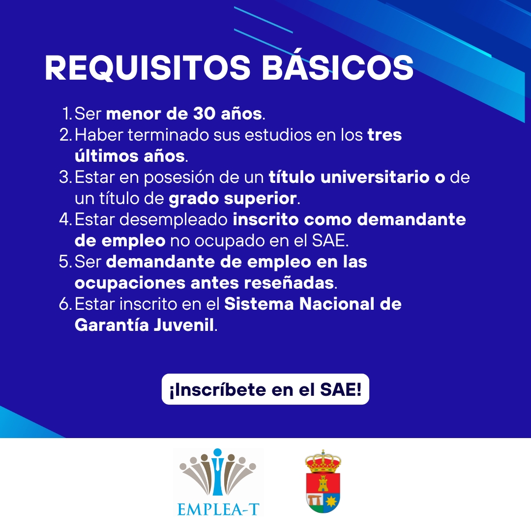 Requisitos para participar: Menor de 30 años. Estudios finalizados en los últimos 3 años. Título universitario o de grado superior. Desempleado/a inscrito/a en el SAE como demandante de empleo no ocupado. Inscrito/a en las ocupaciones mencionadas. Inscrito/a en el Sistema Nacional de Garantía Juvenil.