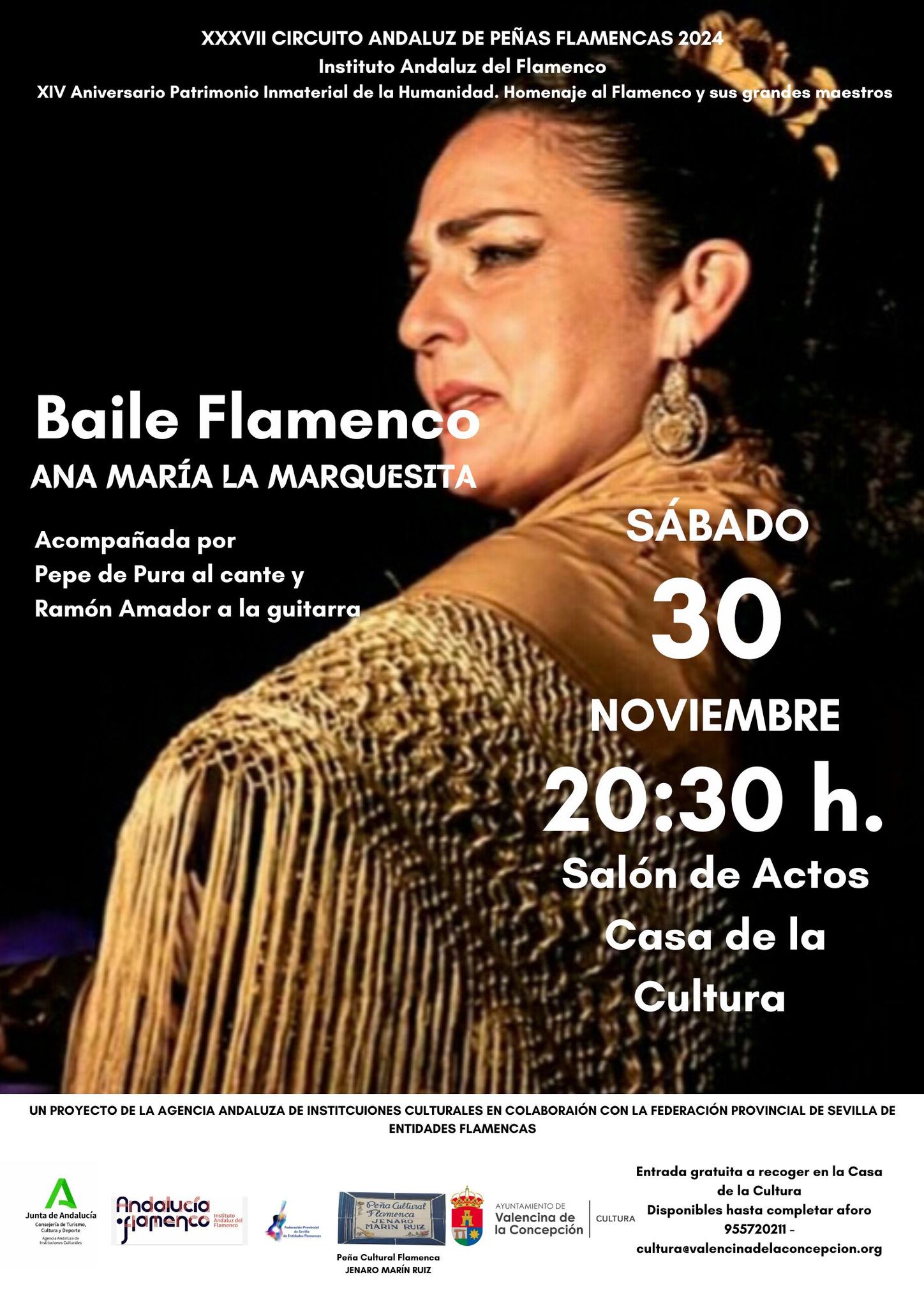 El próximo sábado 30 de noviembre, a las 20:30 h. en el Salón de Actos de la Casa de la Cultura podremos disfrutar de un espectáculo de baile flamenco a cargo de la bailaora Ana María La Marquesita acompañada de Pepe de Pura al cante y de Ramón Amador a la guitarra.