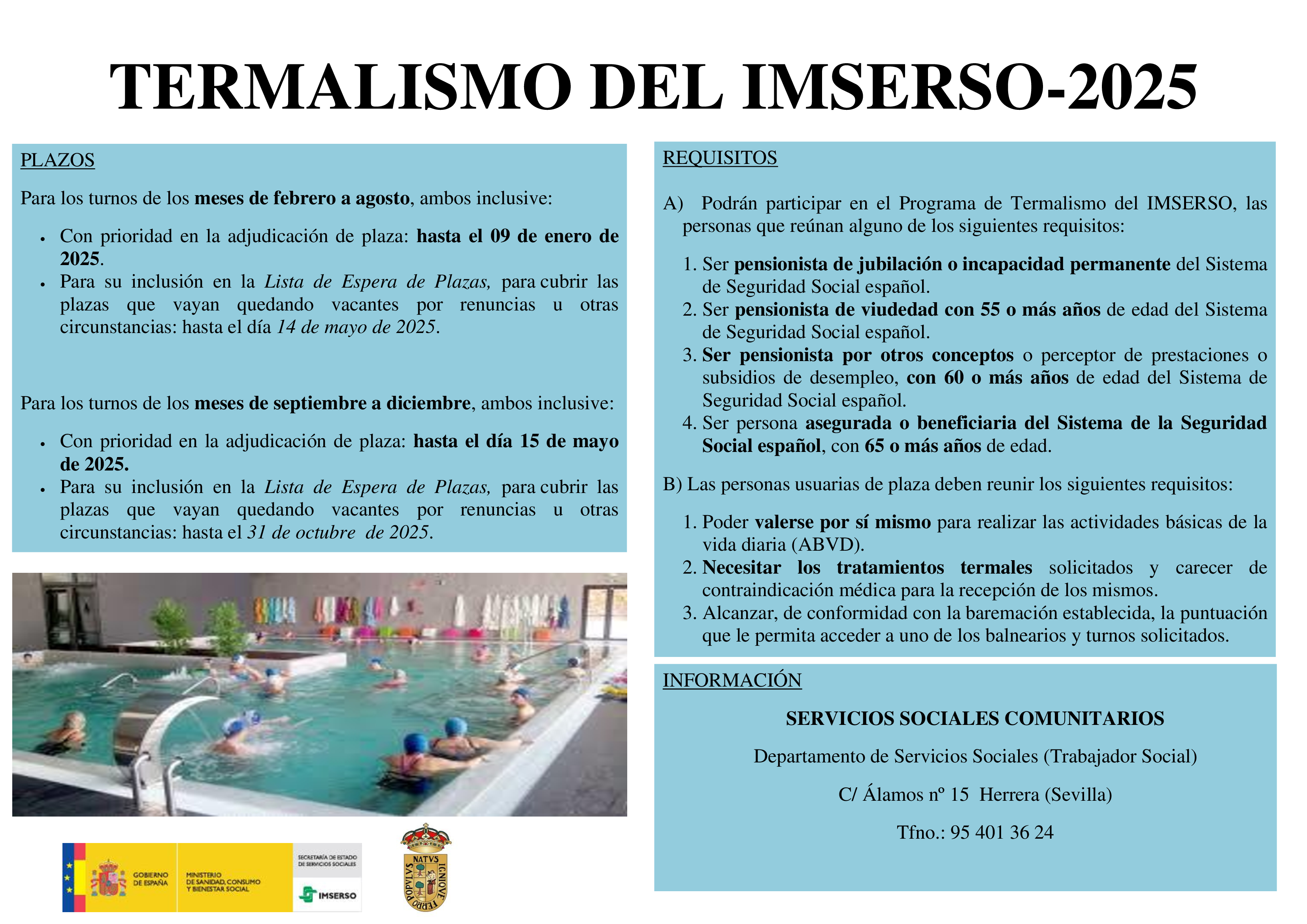 El Instituto de Mayores y Servicios Sociales (Imserso) desarrolla el Programa de Termalismo para personas mayores y mantenimiento del empleo, como servicio complementario de las prestaciones del sistema de Seguridad Social para el cumplimiento de sus competencias y objetivos fijados en el ámbito del envejecimiento activo.
