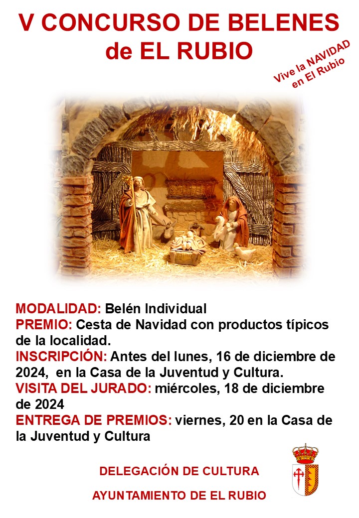 Dentro del programa de actividades navideñas, la Delegación de Cultura del Ayuntamiento de El Rubio convoca el V Concurso de Belenes de la localidad. El concurso contará con la modalidad, "Belén individual".