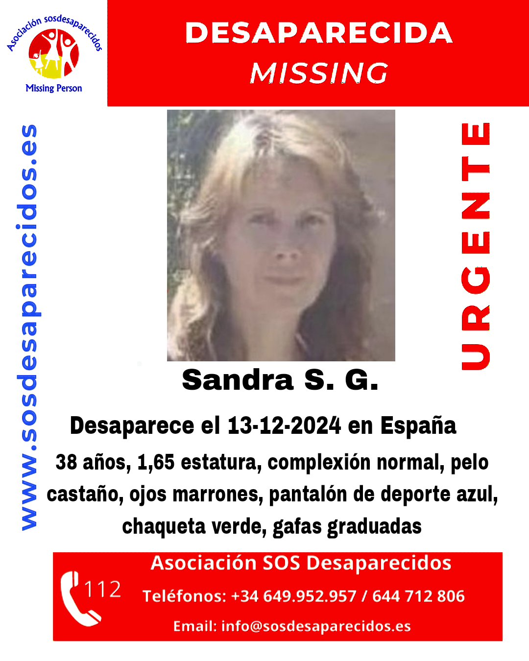 Sandra, de complexión normal, 1,65 metros de estatura, pelo castaño y ojos marrones fue vista por última vez vestida con pantalón de deporte azul, chaqueta verde y gafas graduadas. Se ruega a cualquier persona que tenga información que contacte con las autoridades, el 112 o a los teléfonos 649 952 957 / 644 712 806.