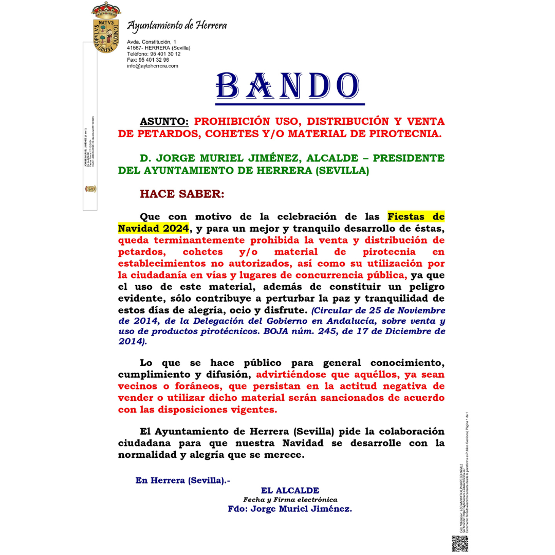 El Ayuntamiento de Herrera, por medio del alcalde Jorge Muriel, informa de la prohibición del uso, distribución y venta de petardos, cohetes y/o material de pirotecnia en establecimientos no autorizados, así como su utilización por la ciudadanía en vías y lugares de concurrencia pública con motivo de la celebración de las Fiestas de Navidad 2024.