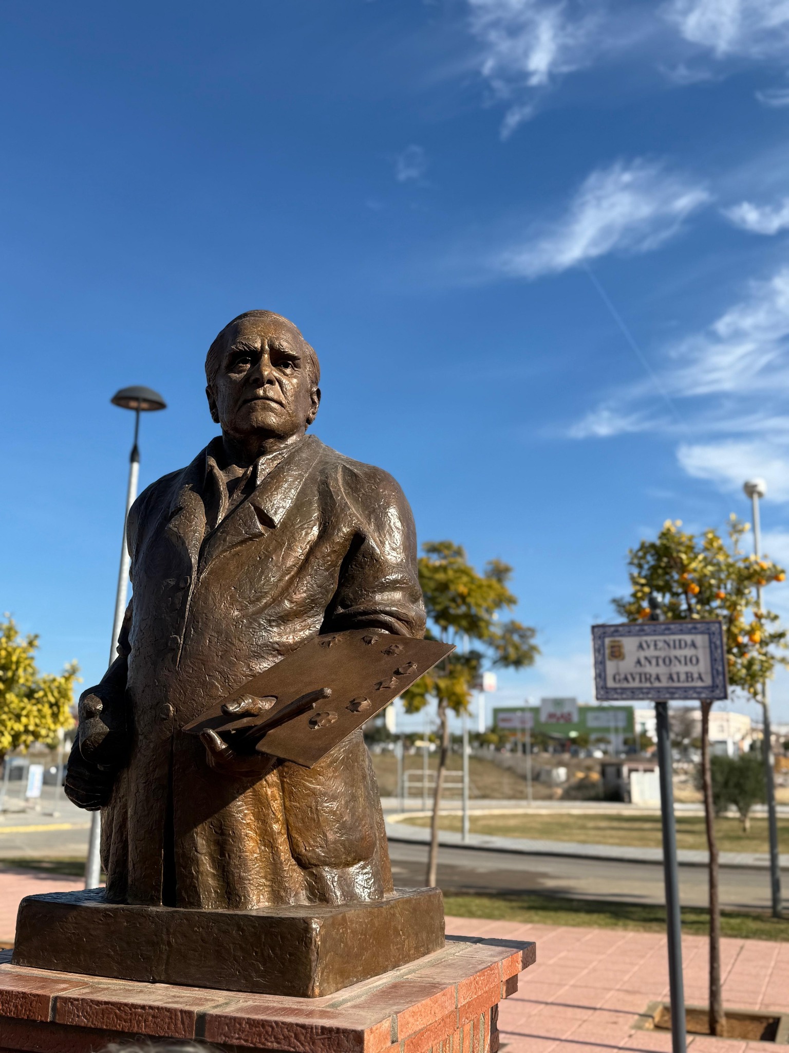 Palabras de Constanza Gavira Galocha, autora del monumento a Don Antonio Gavira Alba: "Con este busto, bulto redondo, donde posa con las herramientas propias de ambas disciplinas, escultura y pintura, se deja constancia que las dominó a la perfección indistintamente. También quise que posara con su bata de trabajo, porque él trabajó hasta sus últimos días.