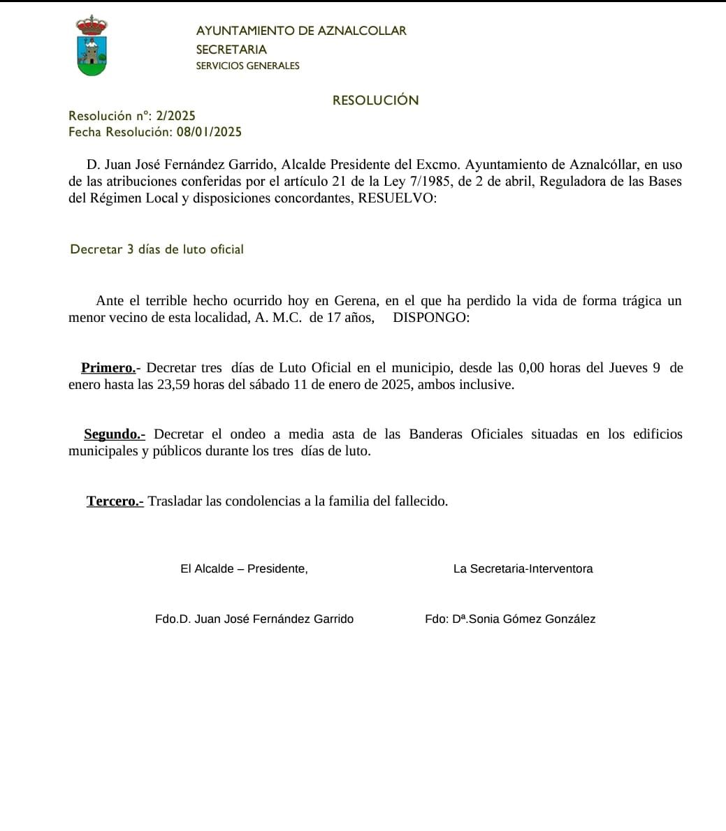 ◼El Ayuntamiento de Aznalcóllar decreta tres días de luto oficial en el municipio por el presunto asesinato de un joven de nuestro pueblo, hoy miércoles , 8 de enero de 2025 en la localidad de Gerena.